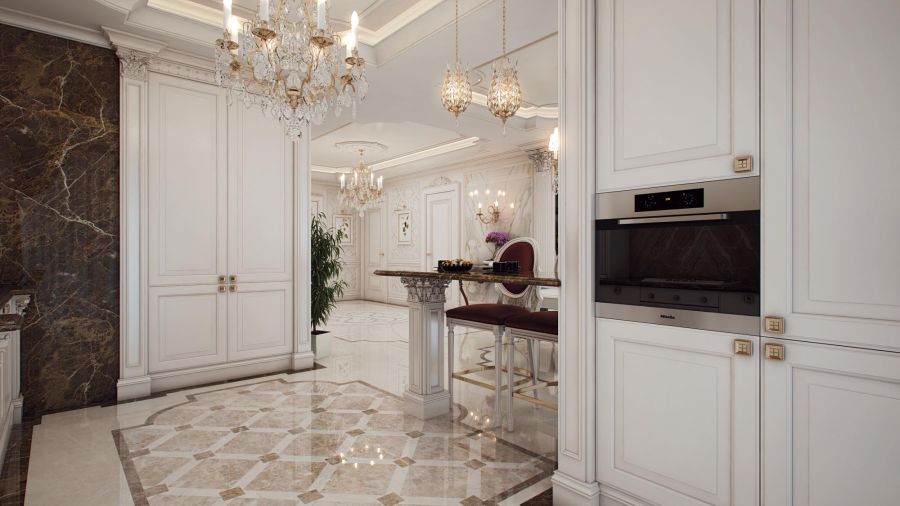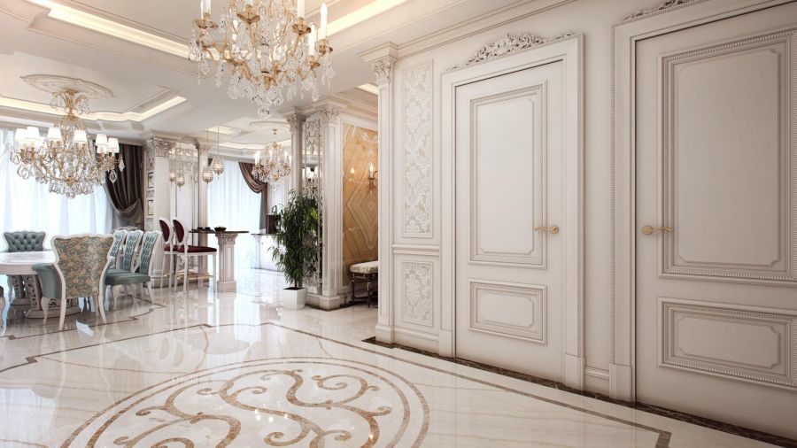 В проекте классического оформления инкрустация напольного покрытия орнаментом помогает обозначить функциональные зоны совмещенного пространства: прихожую, холл, кухню, столовую.