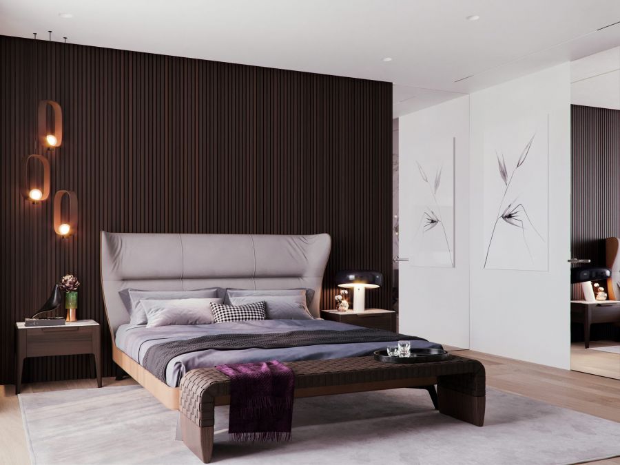 В современном дизайне двухкомнатной квартиры темно-коричневые настенные панели задают колористику для оформления прихожей и коридора, общего с гостиной-кухней. А потолочная и настенная обшивка в виде узких деревянных планок становится приемом, связывающим декор коридора, спальни и рабочего кабинета на лоджии.