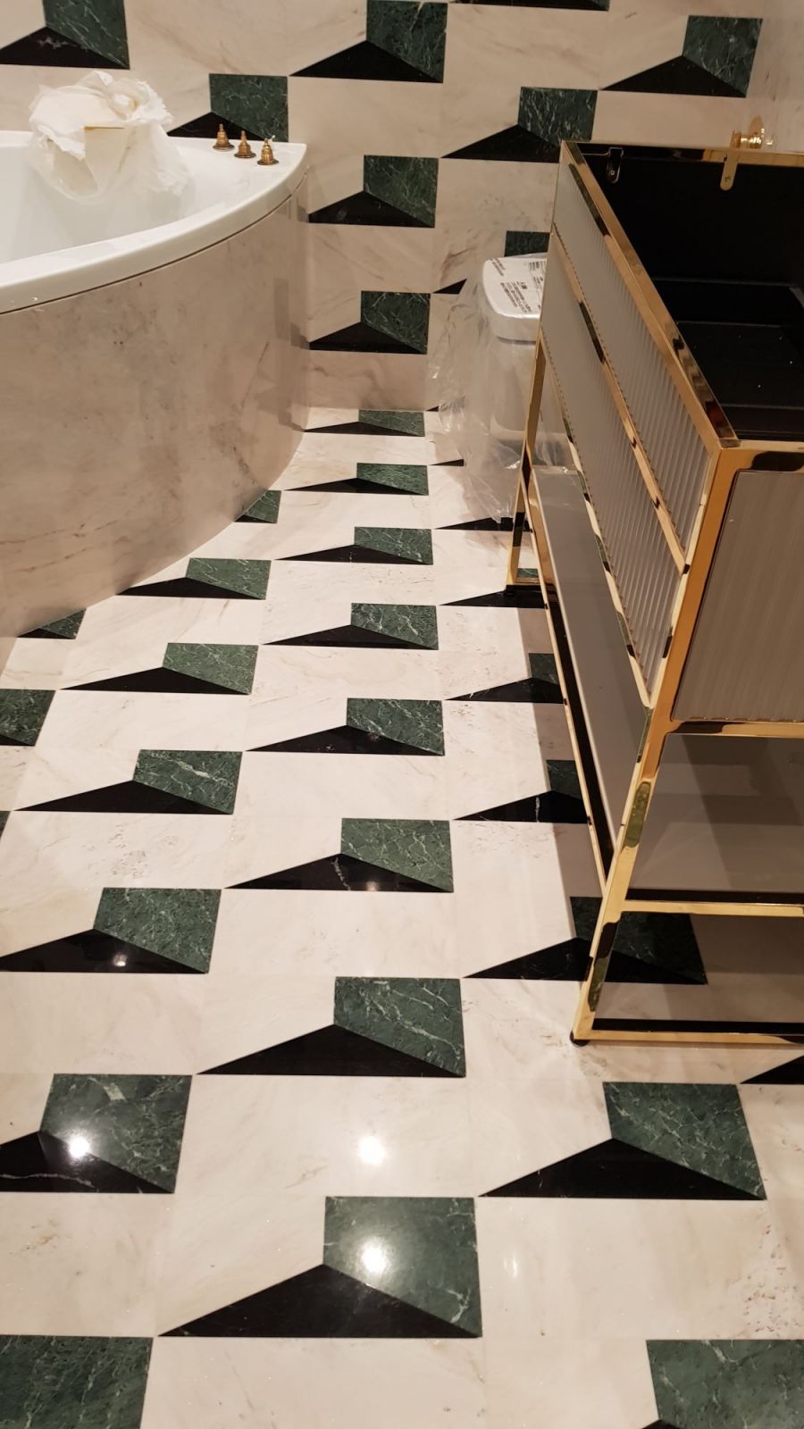 - темно-зеленой плиткой обозначены поверхности в душевой зоне и над угловой ванной;