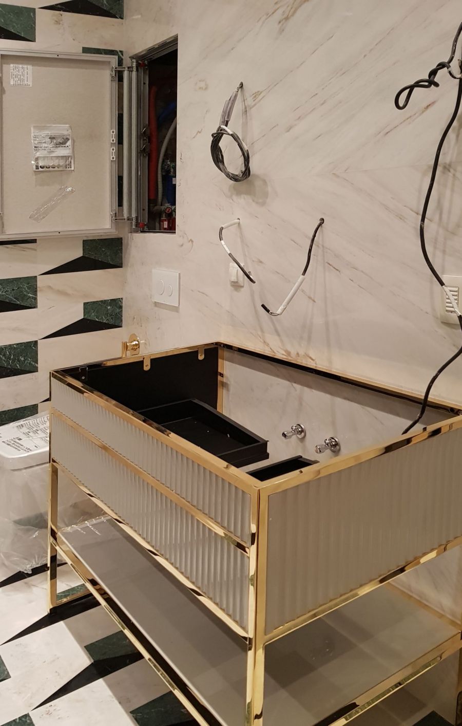 Техническую нишу с коммуникациями прикрывает люк-невидимка, снаружи облицованный каменной панелью. Точная разметка и грамотная последовательность ремонтных работ позволила аккуратно вывести провода для системы освещения сквозь каменную обшивку.