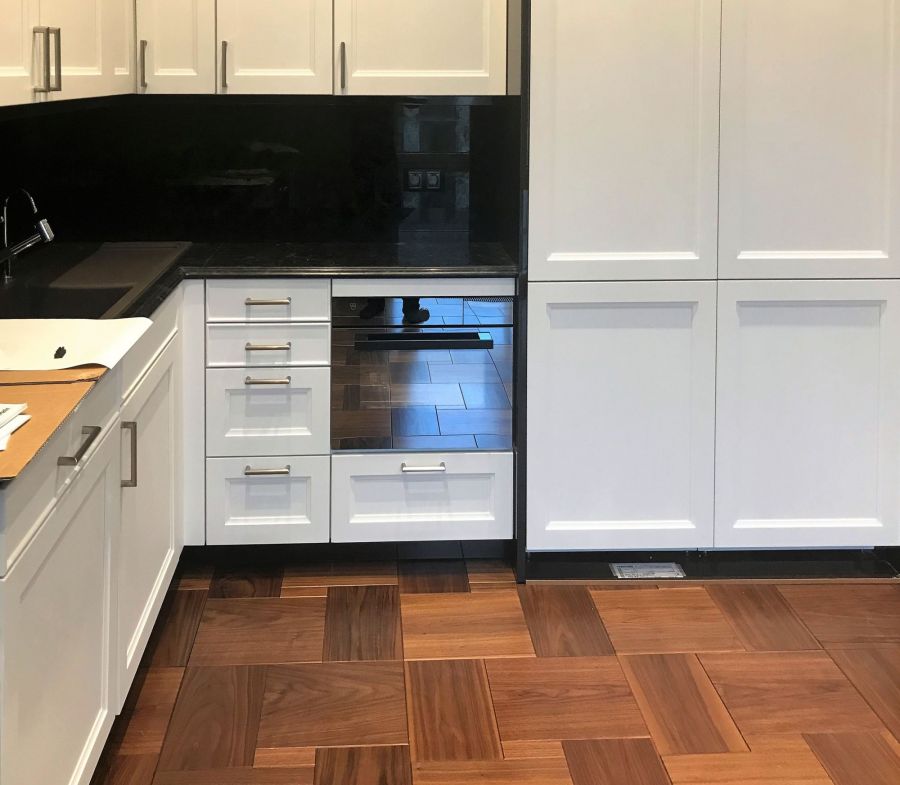 В ходе ремонта и отделки интерьера квартиры были решены технические задачи. В частности монтаж вентиляционной решетки в паркетный пол.