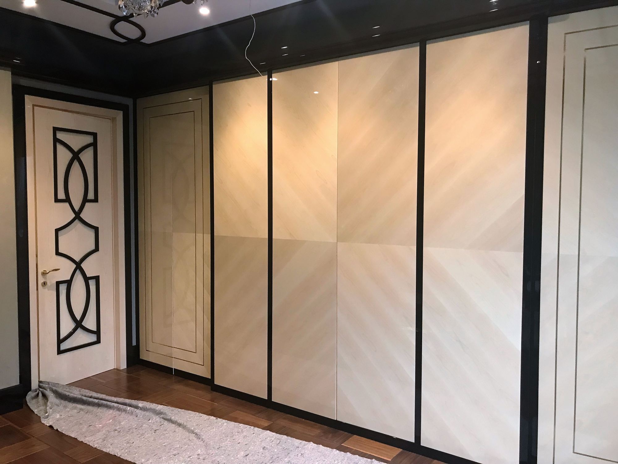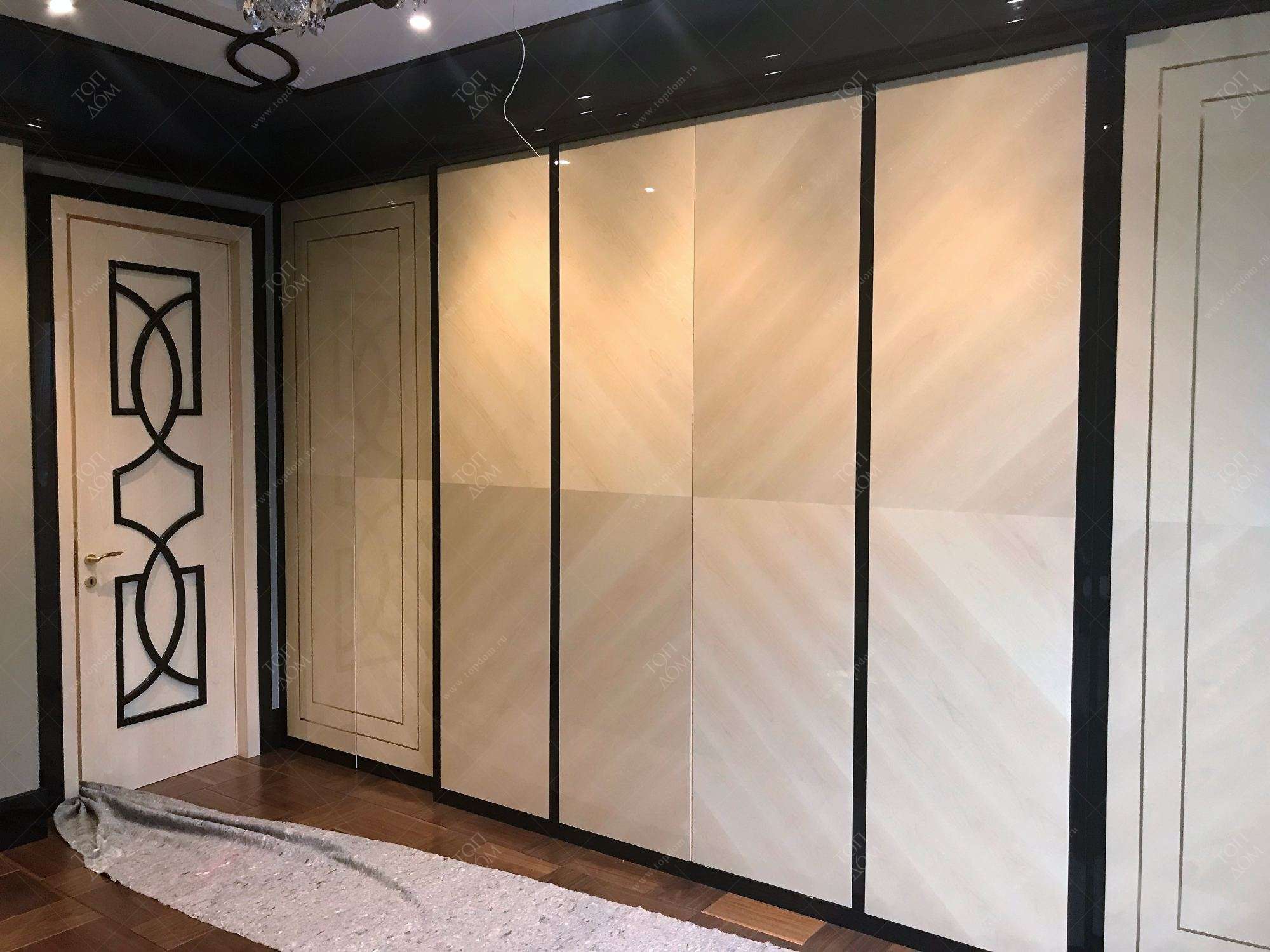 Встроенные шкафы с глянцевыми распашными дверями в прихожей украшены геометрическим рисунком шпона, который становится заметен при попадании естественного или искусственного освещения.