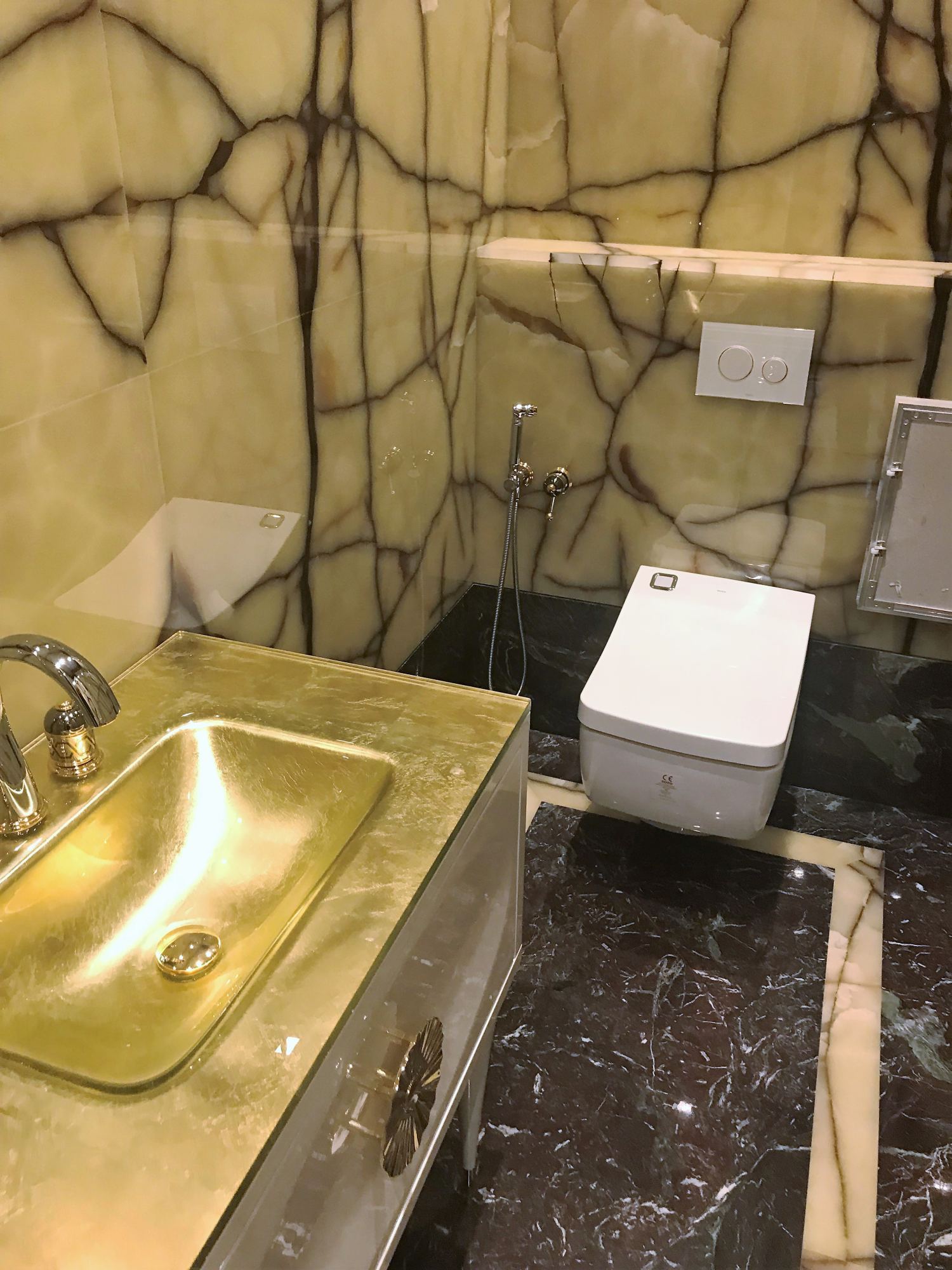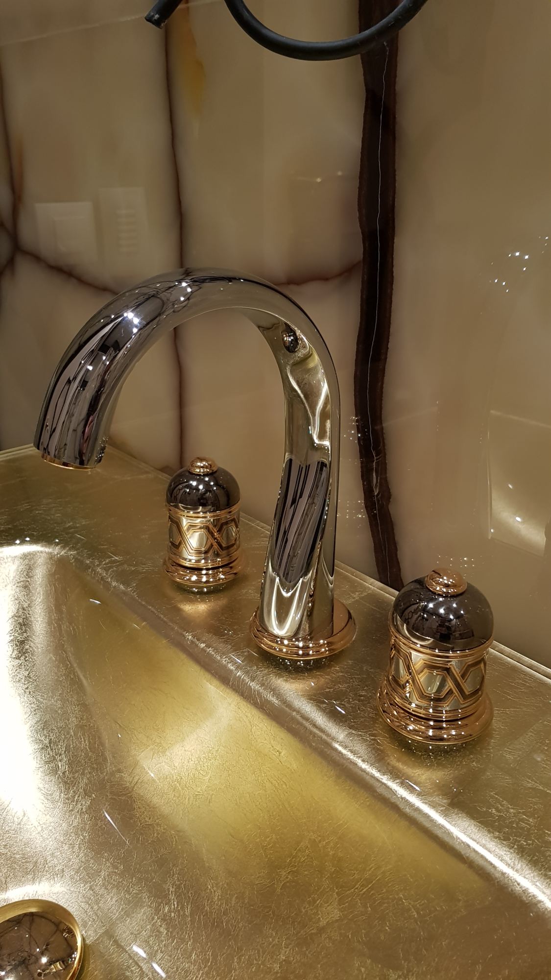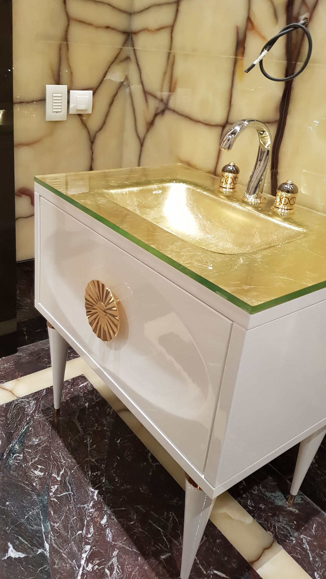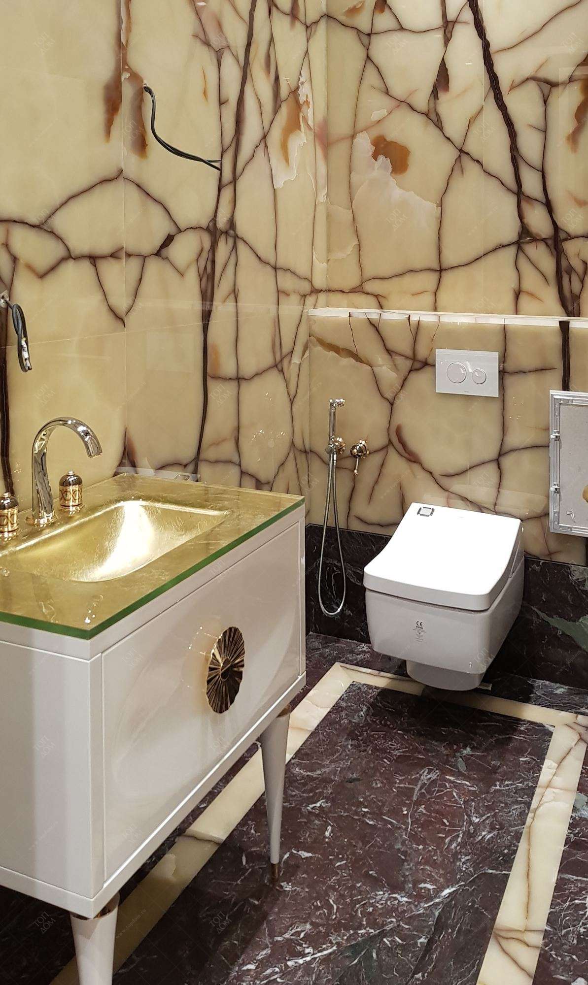 Как и в остальных ванных комнатах, роскошная мебель акцентирует здесь зону для умывания. В изящную лакированную тумбу встроена позолоченная раковина.