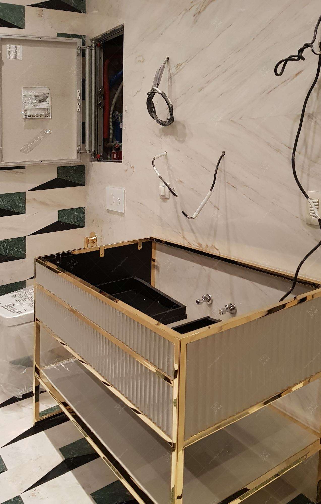 Золотистые акценты присутствуют и здесь, их вводит латунный декор тумбы под раковину с рифлеными серыми фасадами.