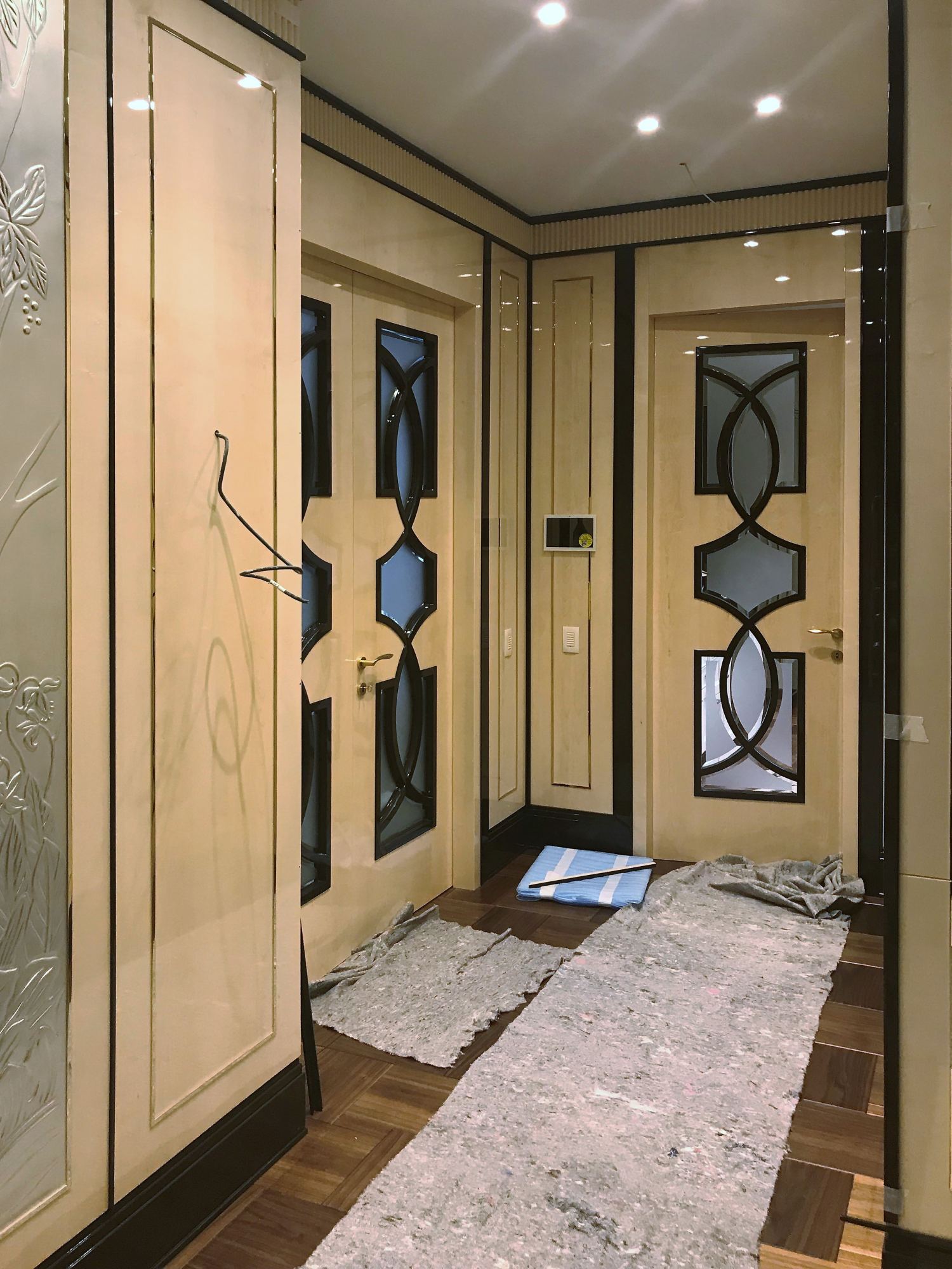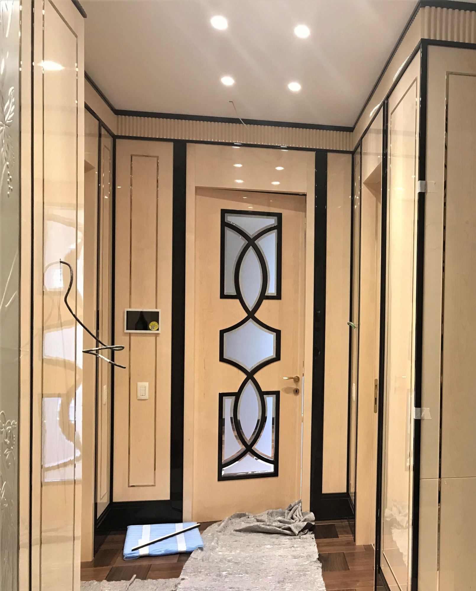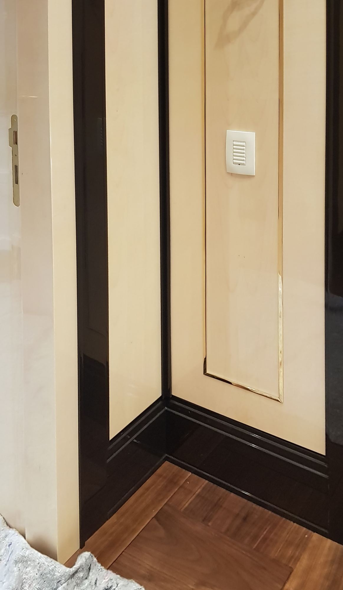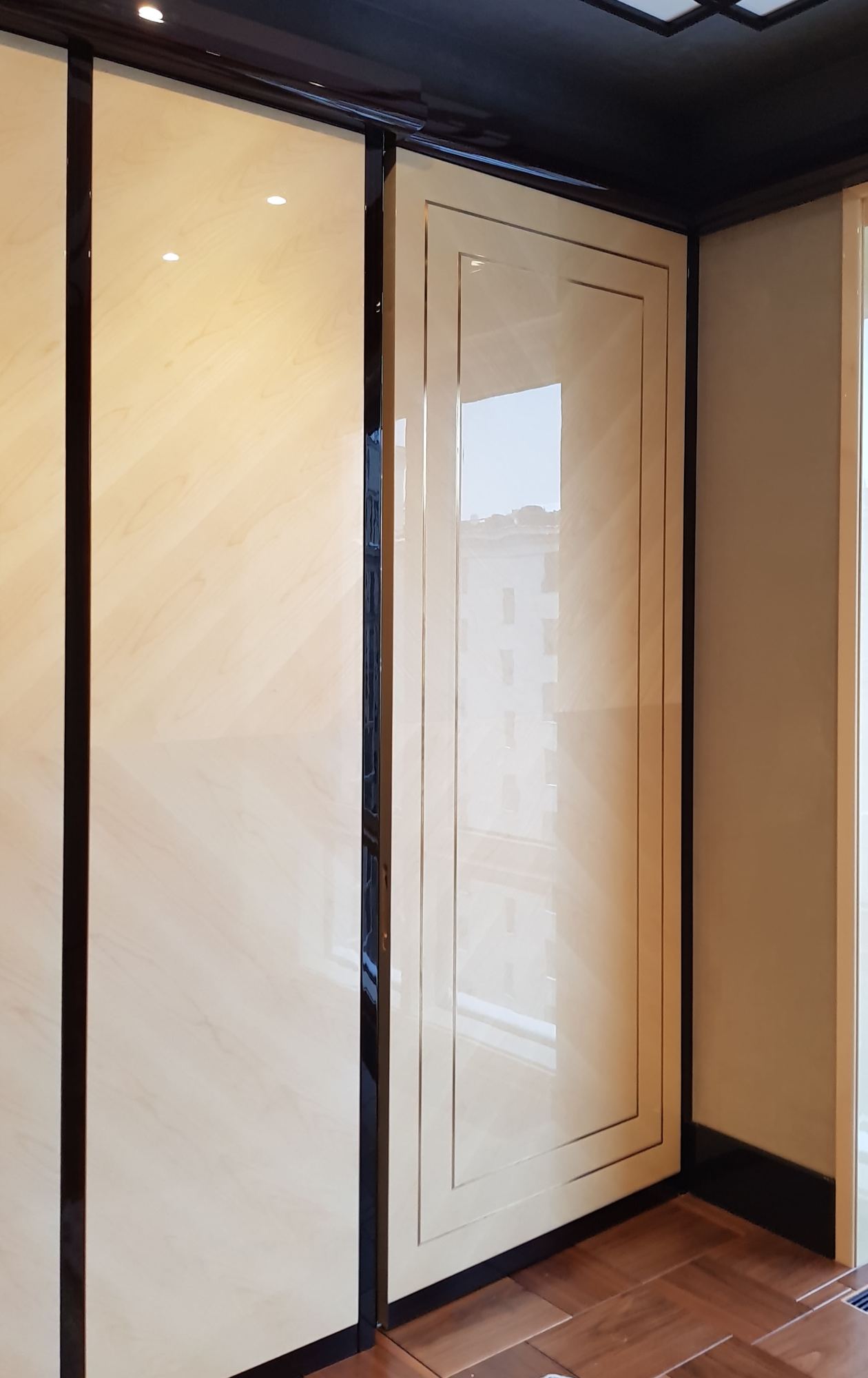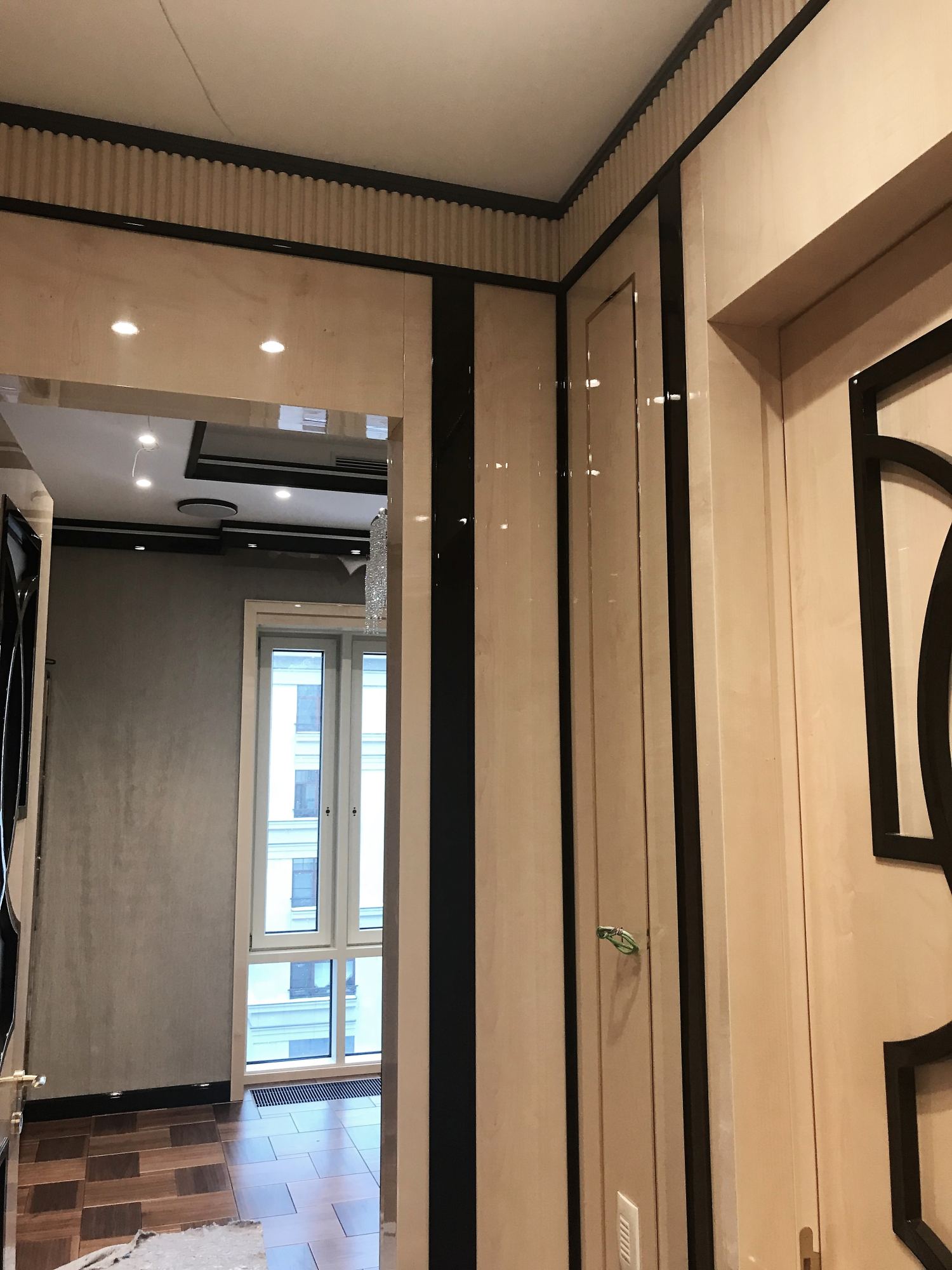 - глянцевым панелям оттенка слоновой кости в коридоре;