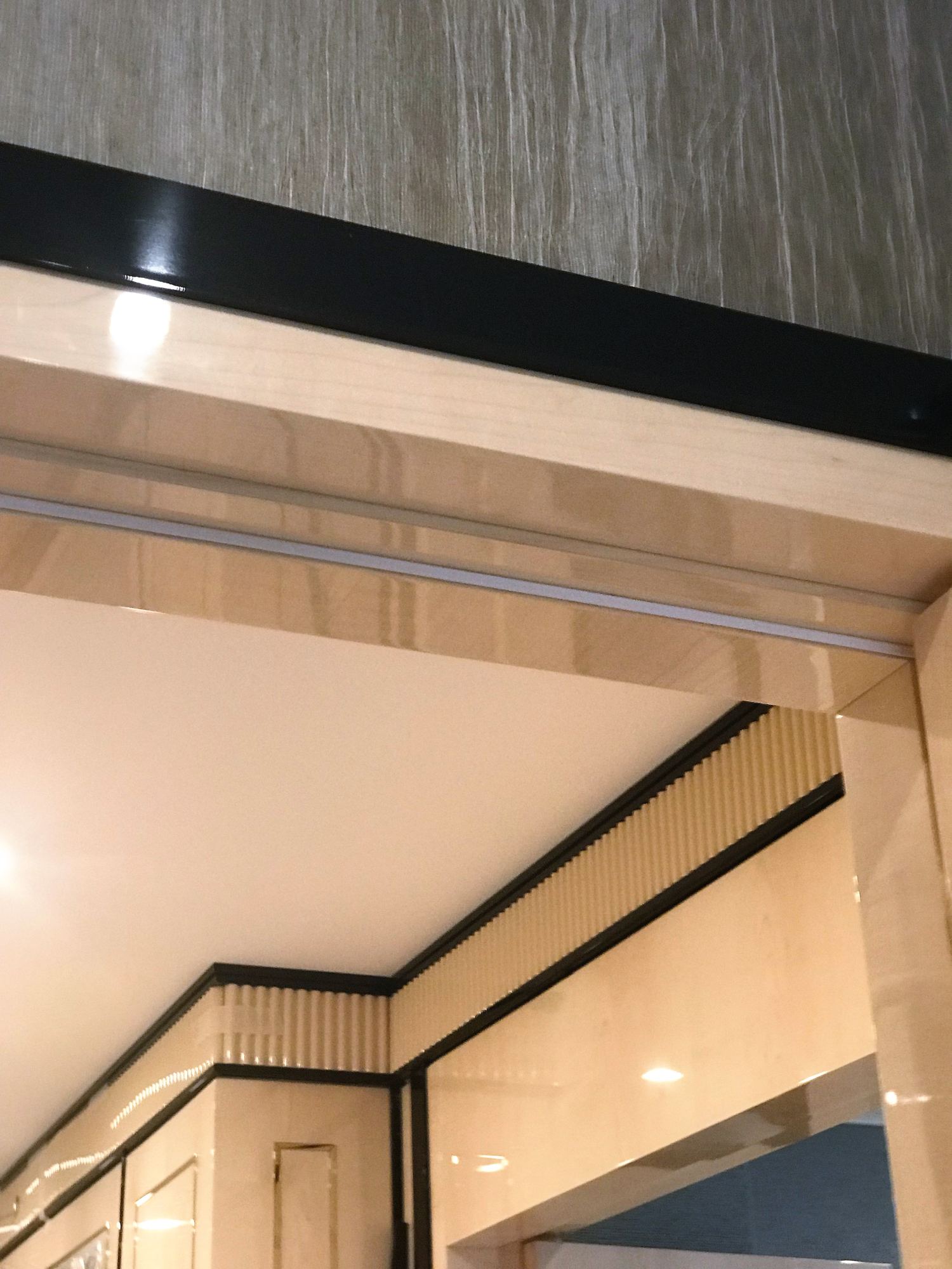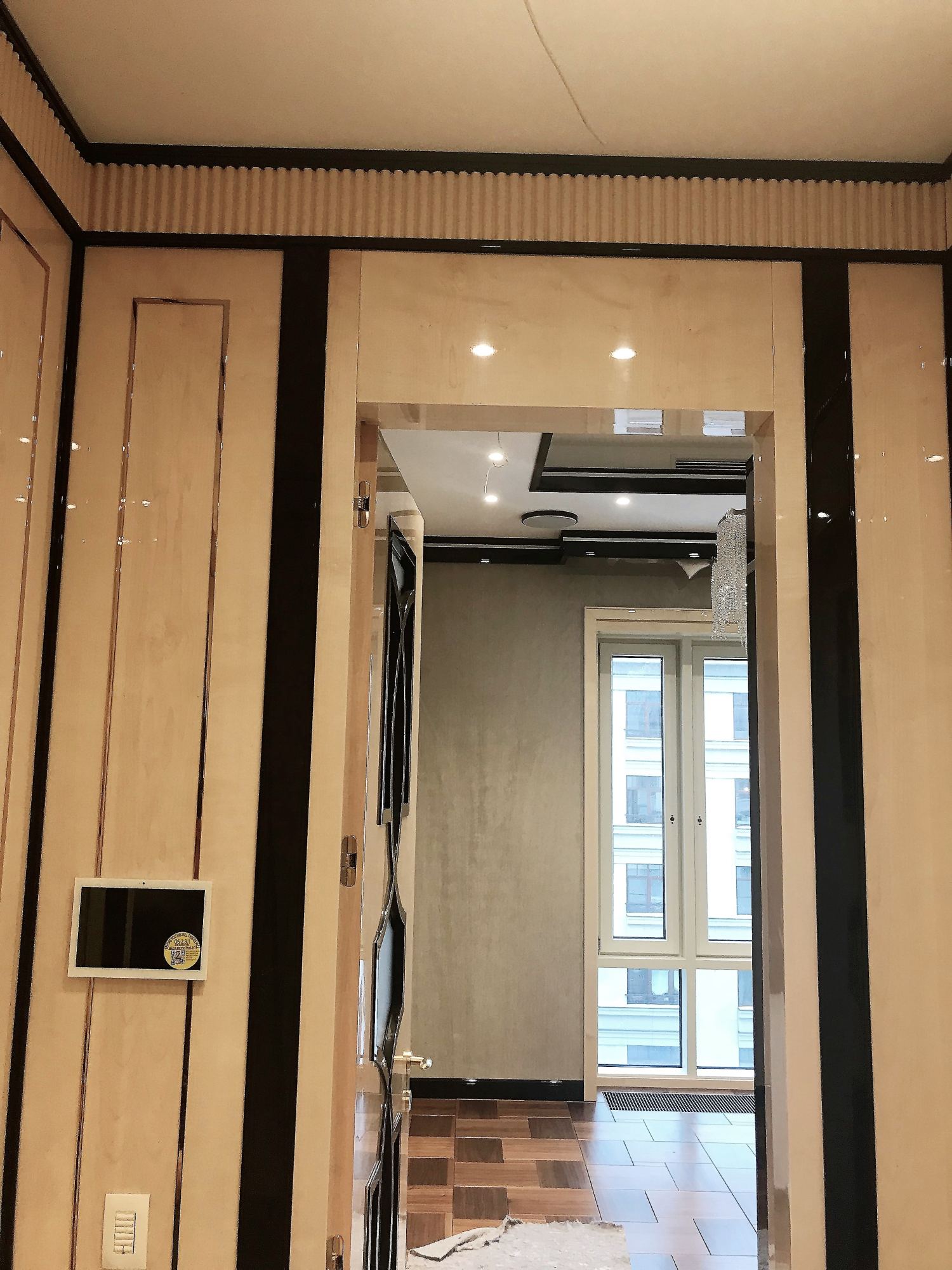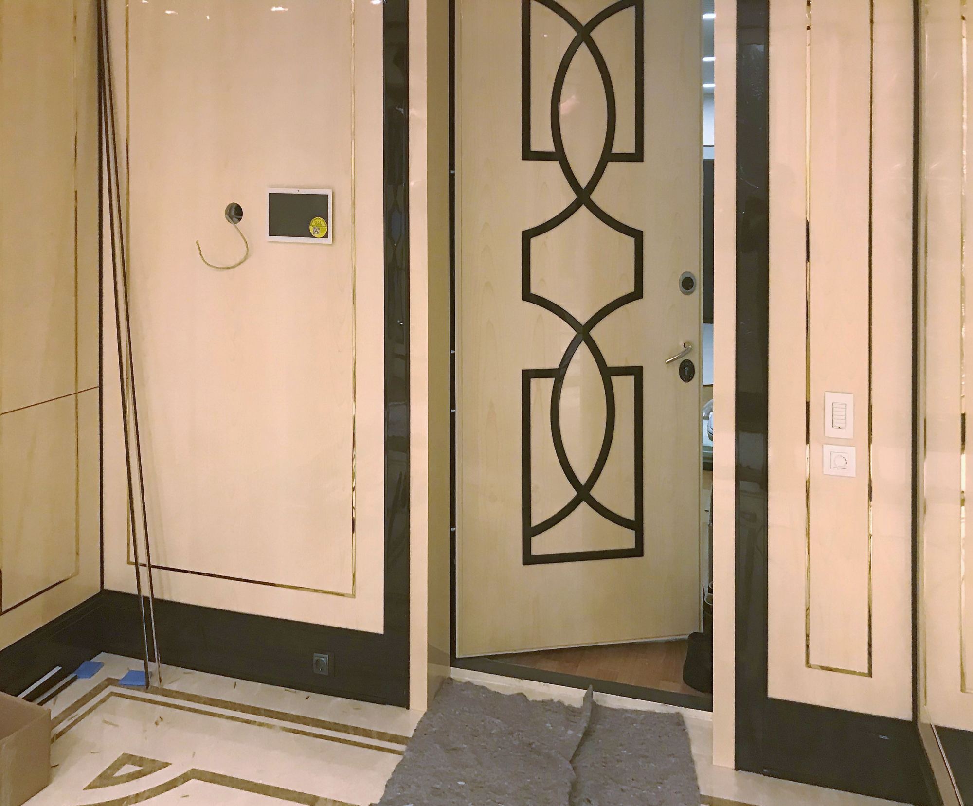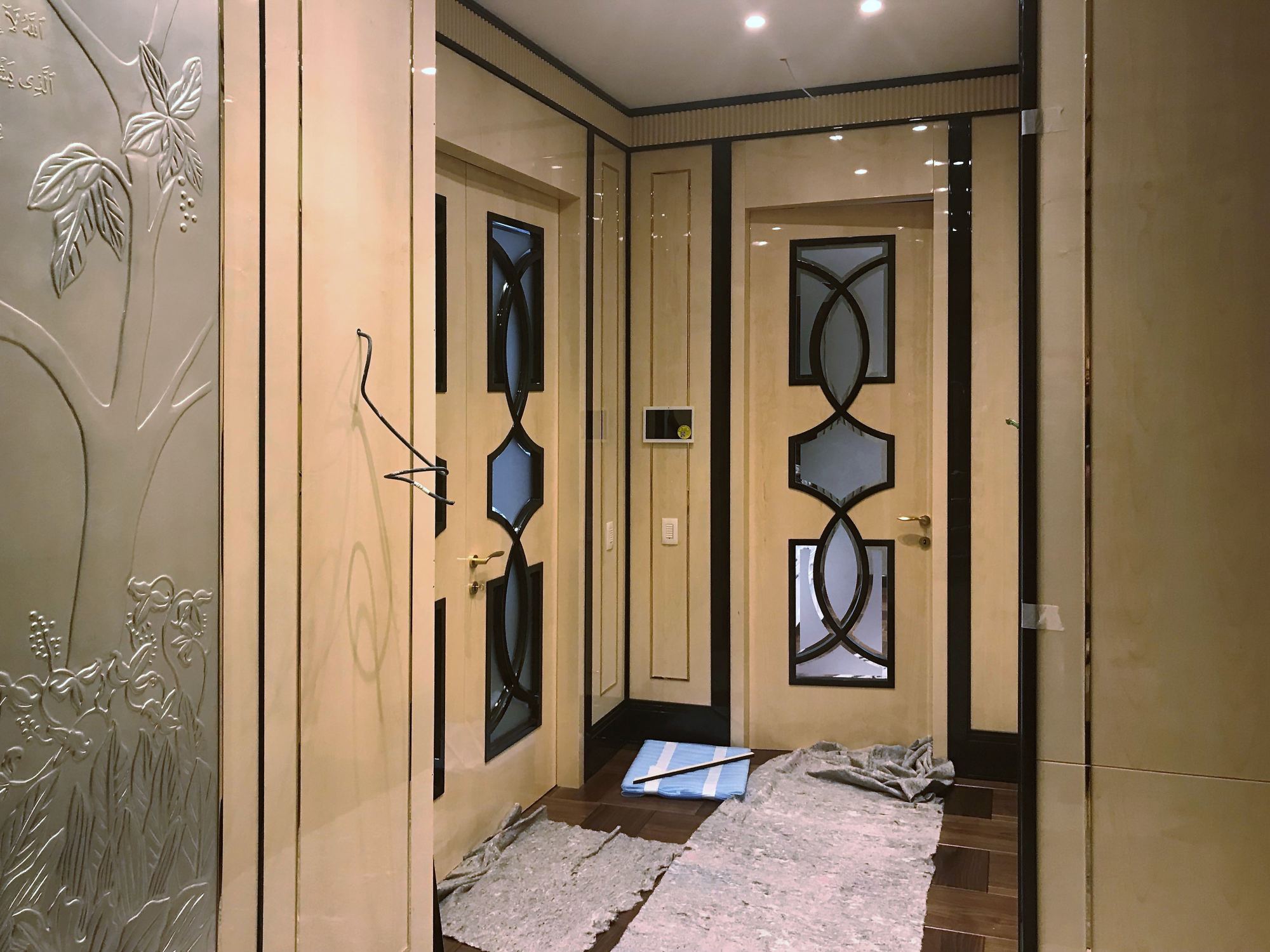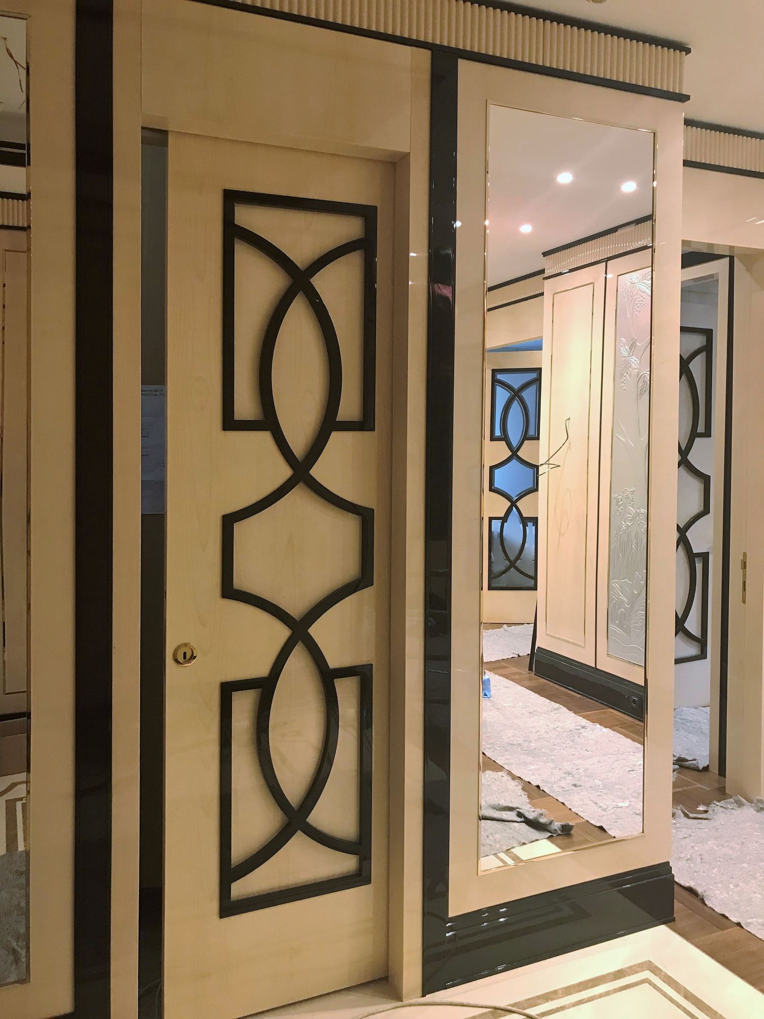 - глянцевым панелям оттенка слоновой кости в коридоре;
