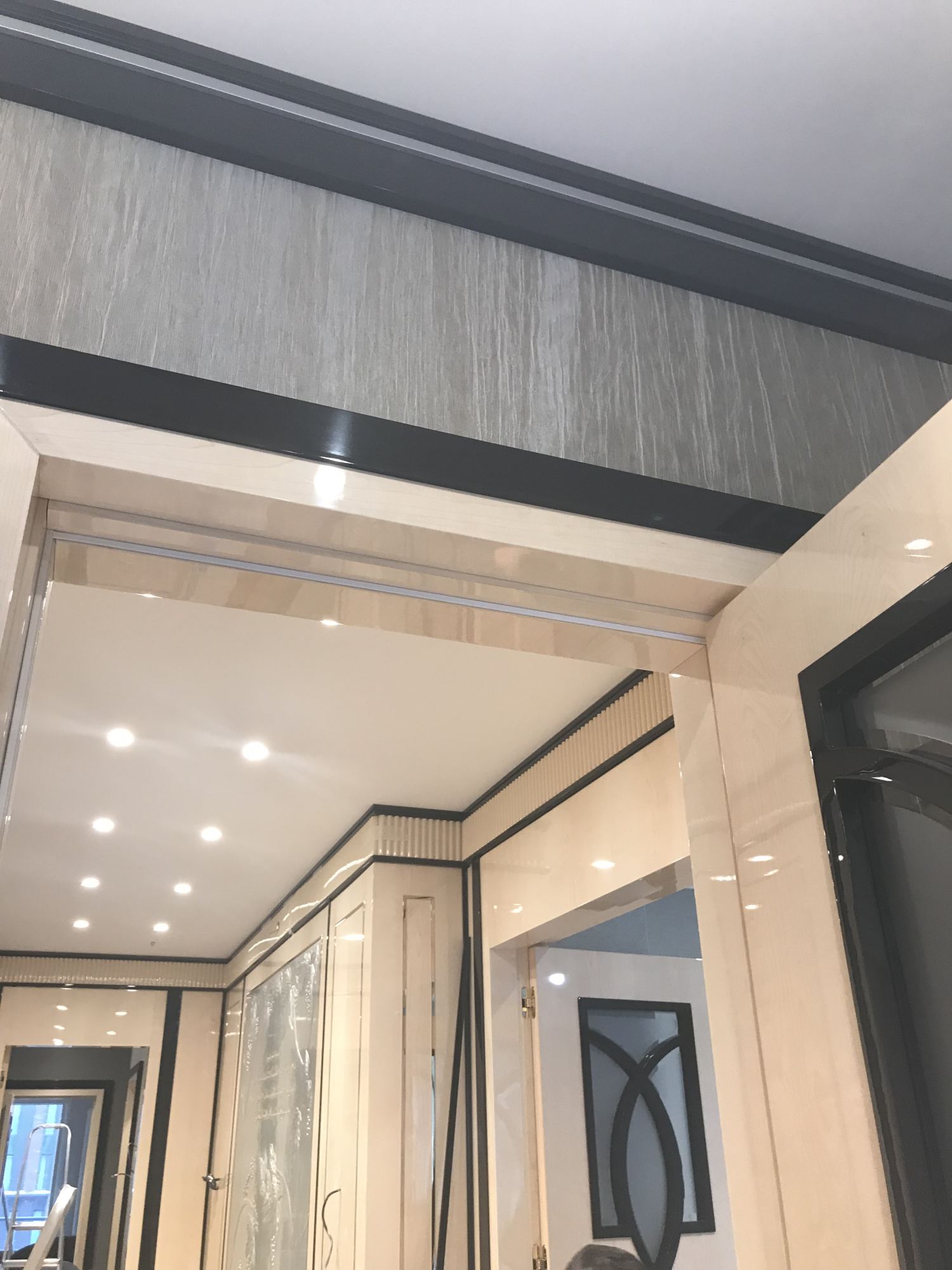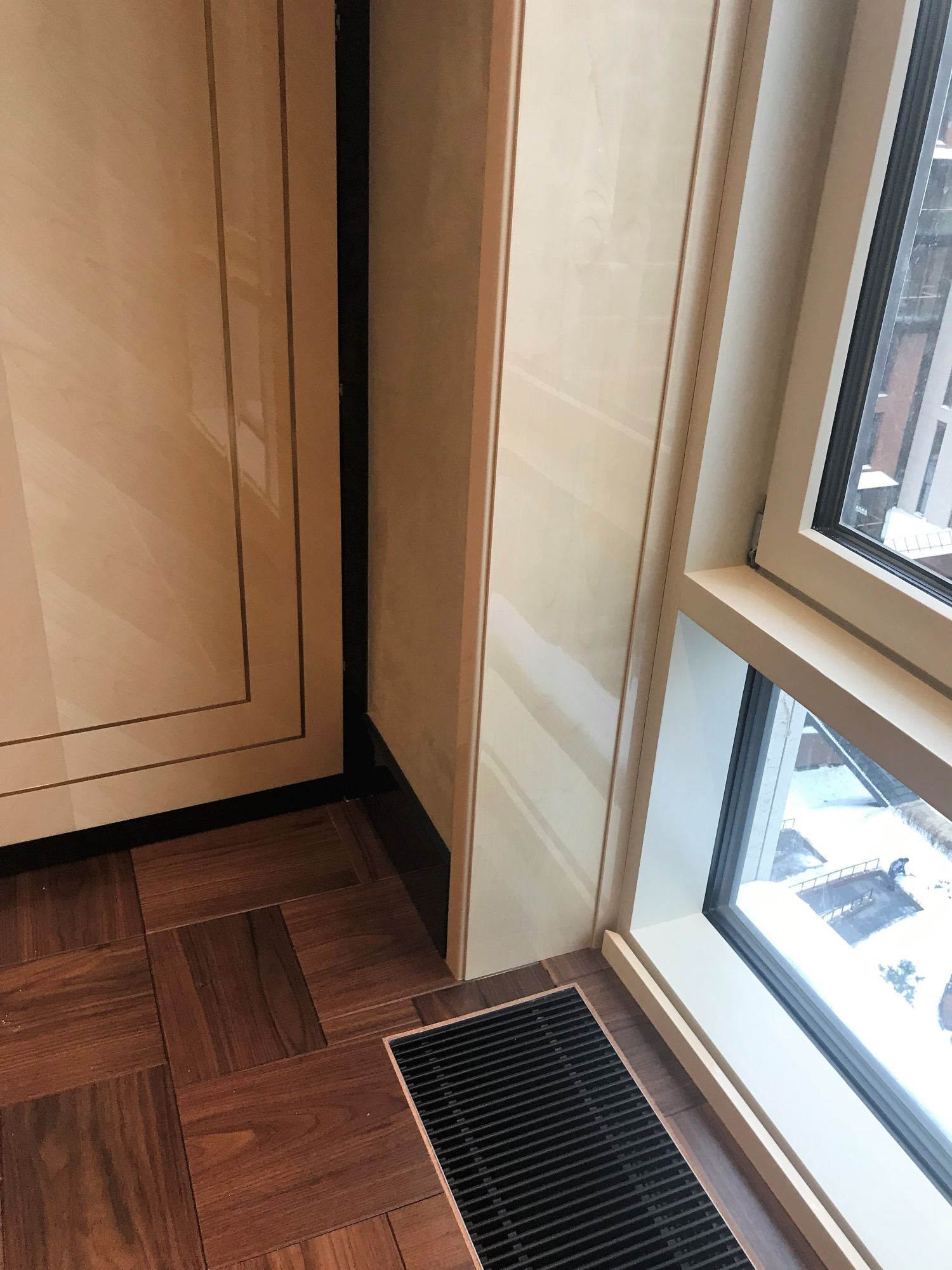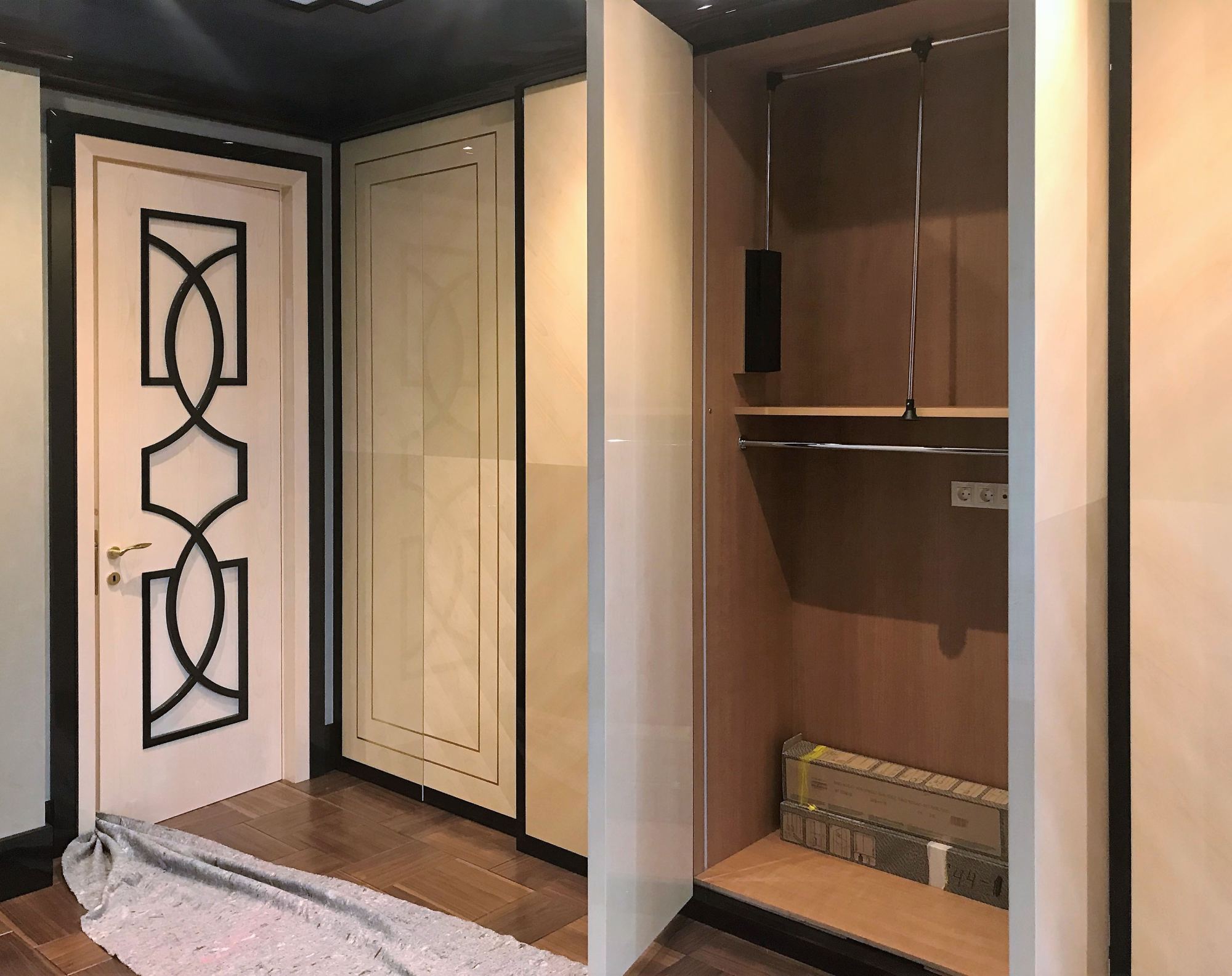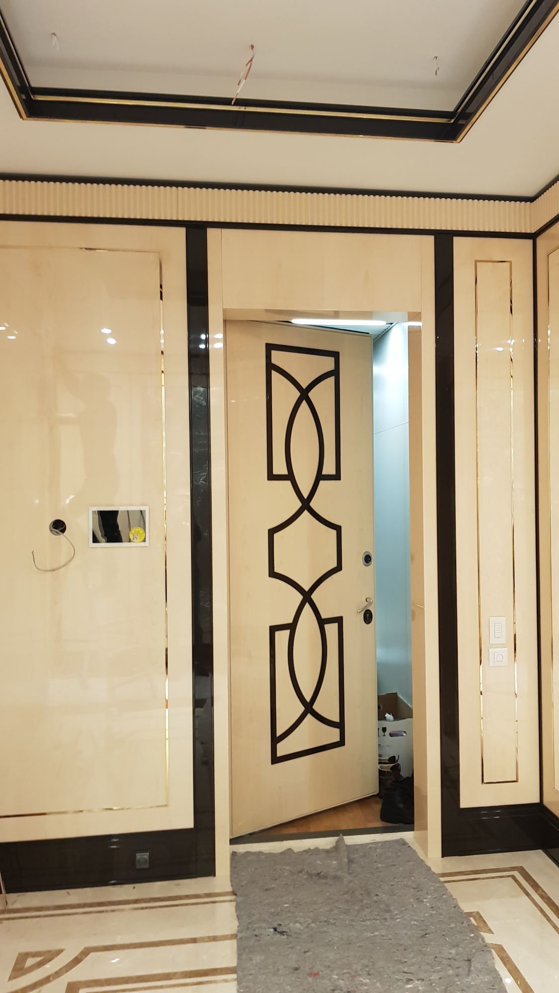 - глянцевым панелям оттенка слоновой кости в коридоре;