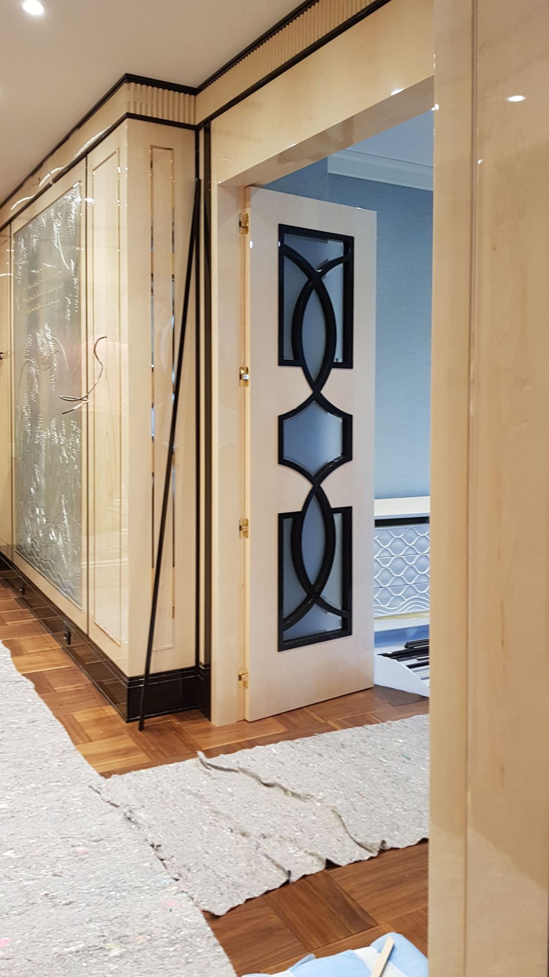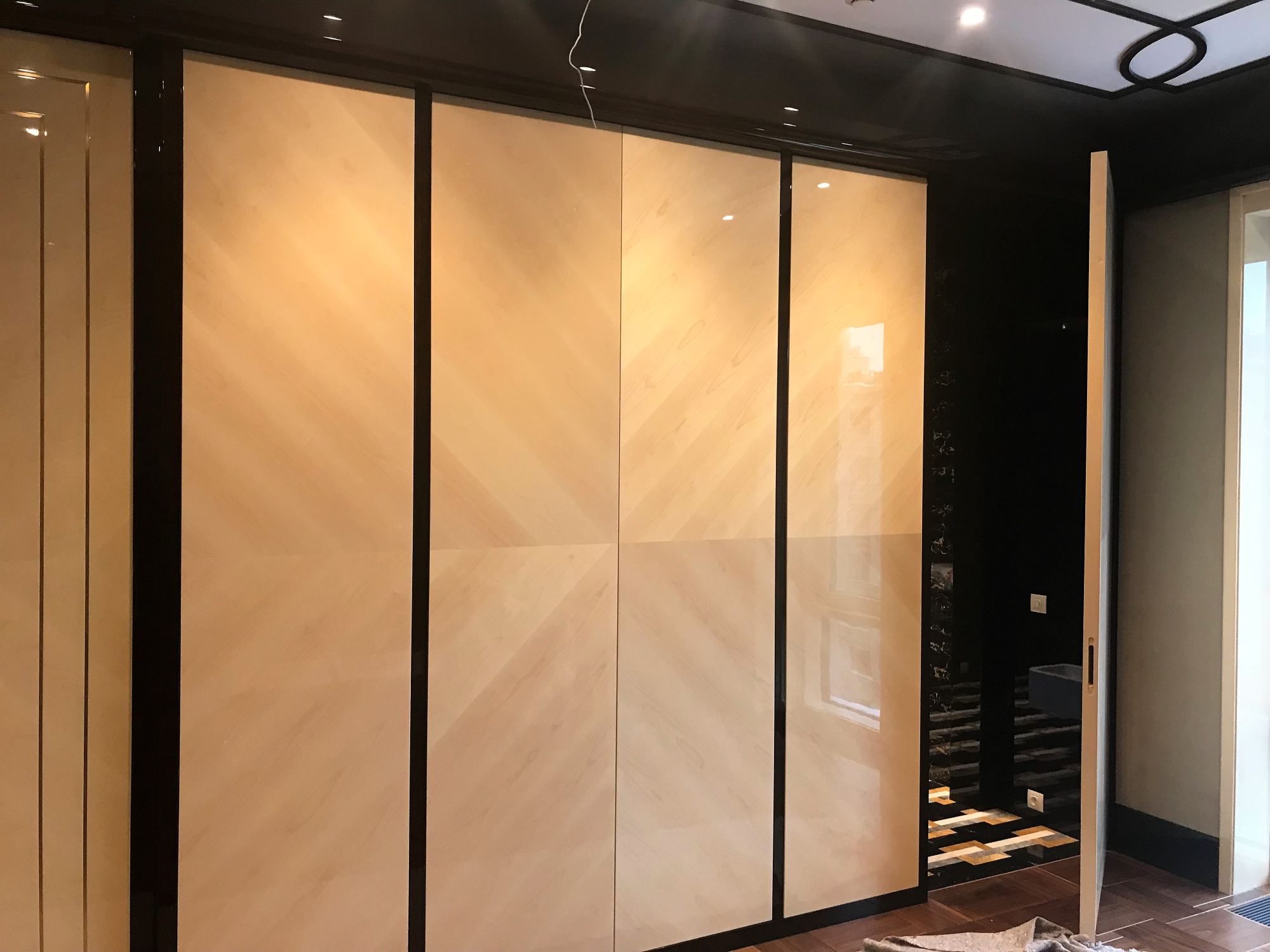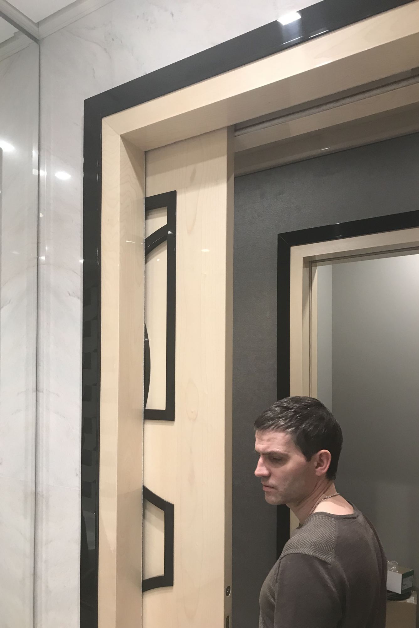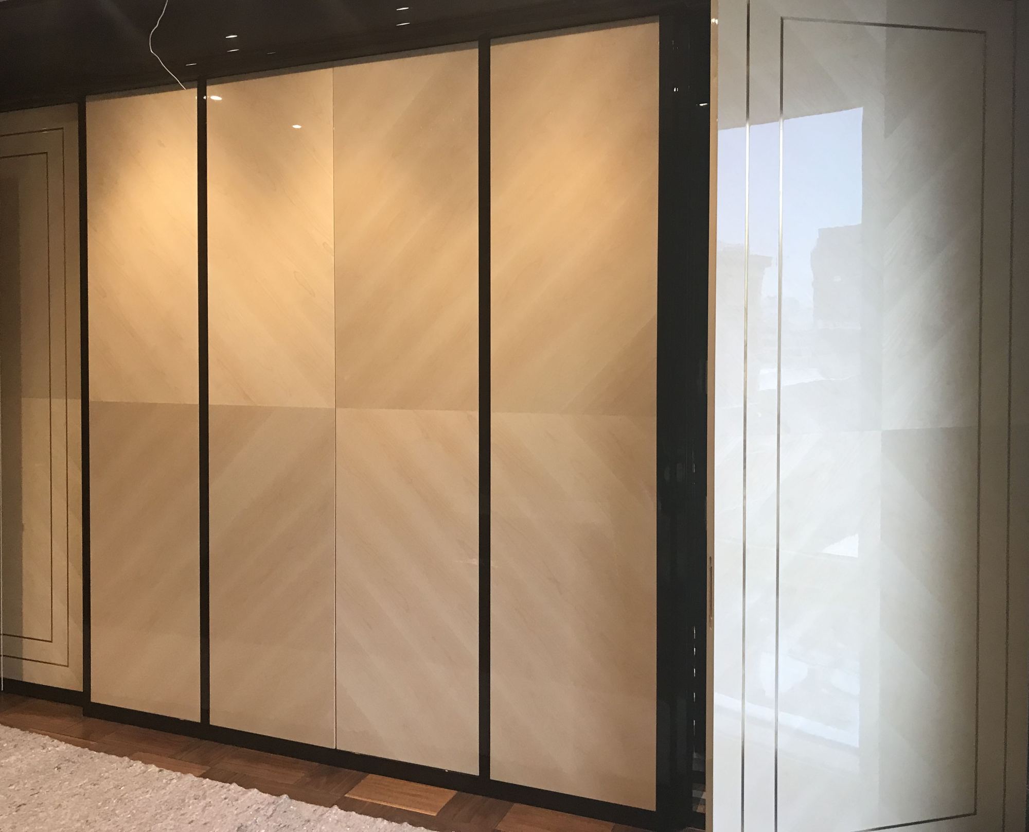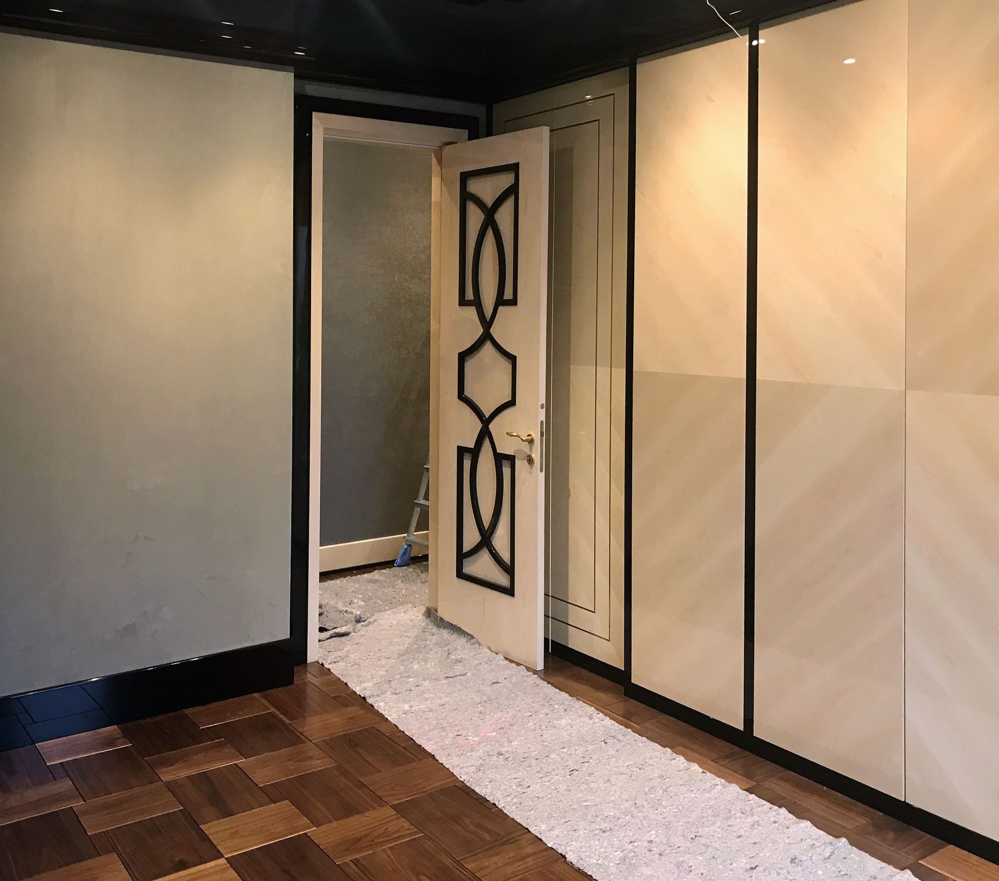 - глянцевым панелям оттенка слоновой кости в коридоре;