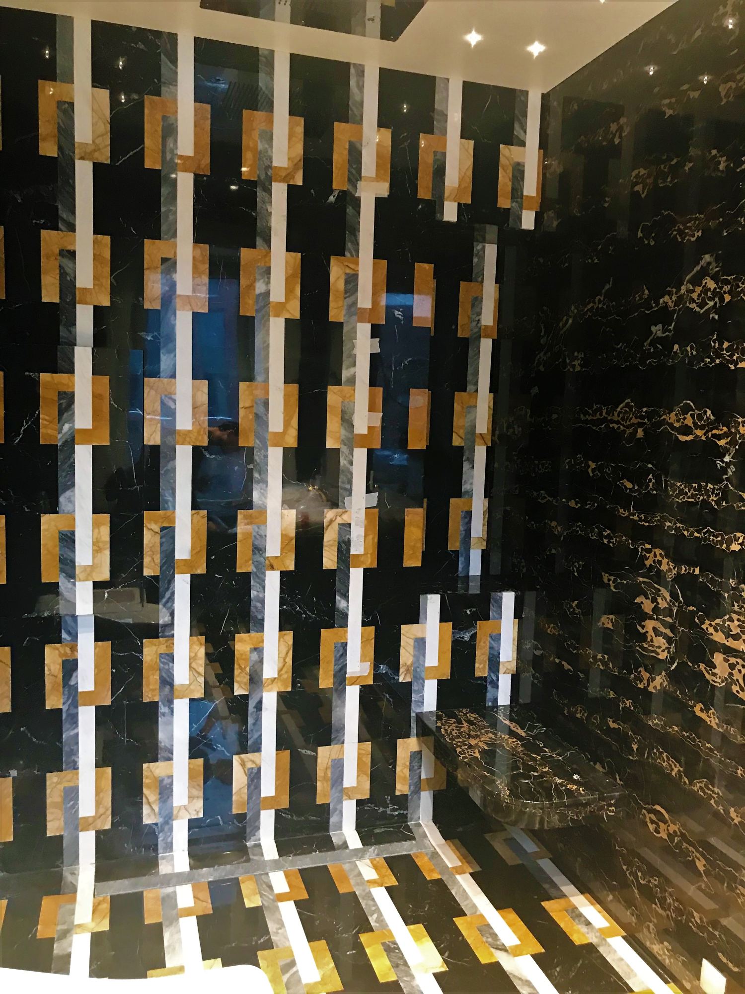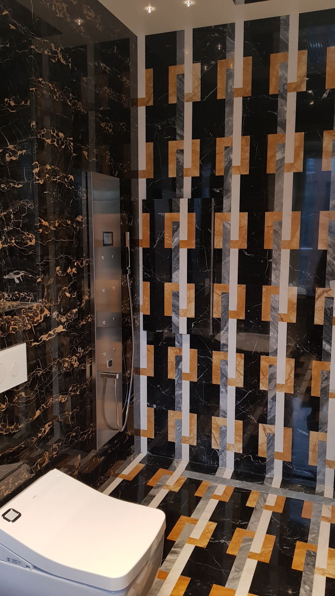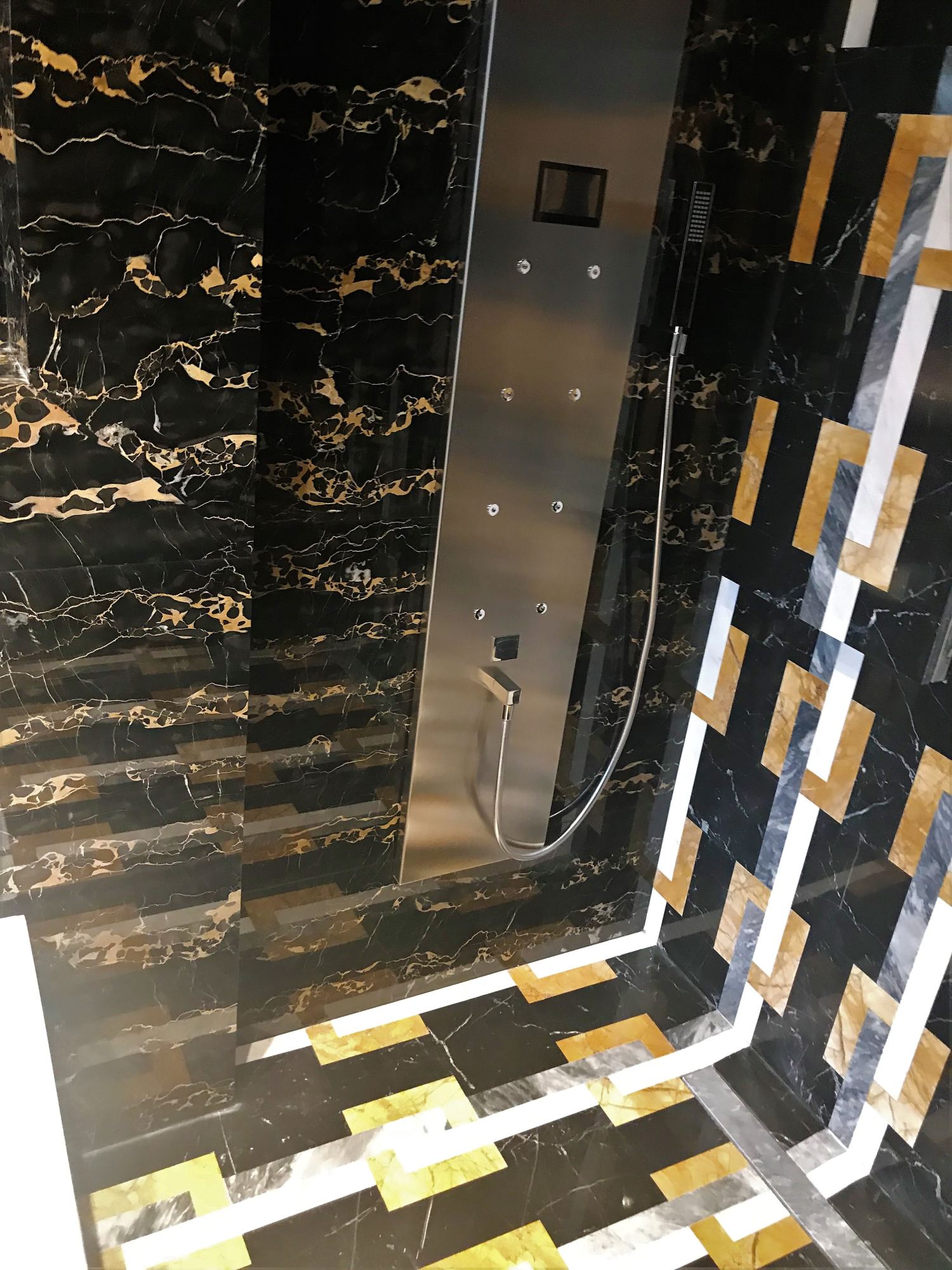 Базовой палитрой стали черный и темно-коричневый цвета, они ассоциируются с роскошной дворцовой обстановкой. За счет того, что одинаковая каменная плитка переходит с пола на стены, формируется цельное интимное пространство с акцентным обозначением душевой зоны. Данный участок выделен пестрым инкрустированным мрамором с геометрическим узором из белых, серых и желтых полос. Стальная матовая текстура душевого оборудования прекрасно сочетается с насыщенными цветами природного покрытия.