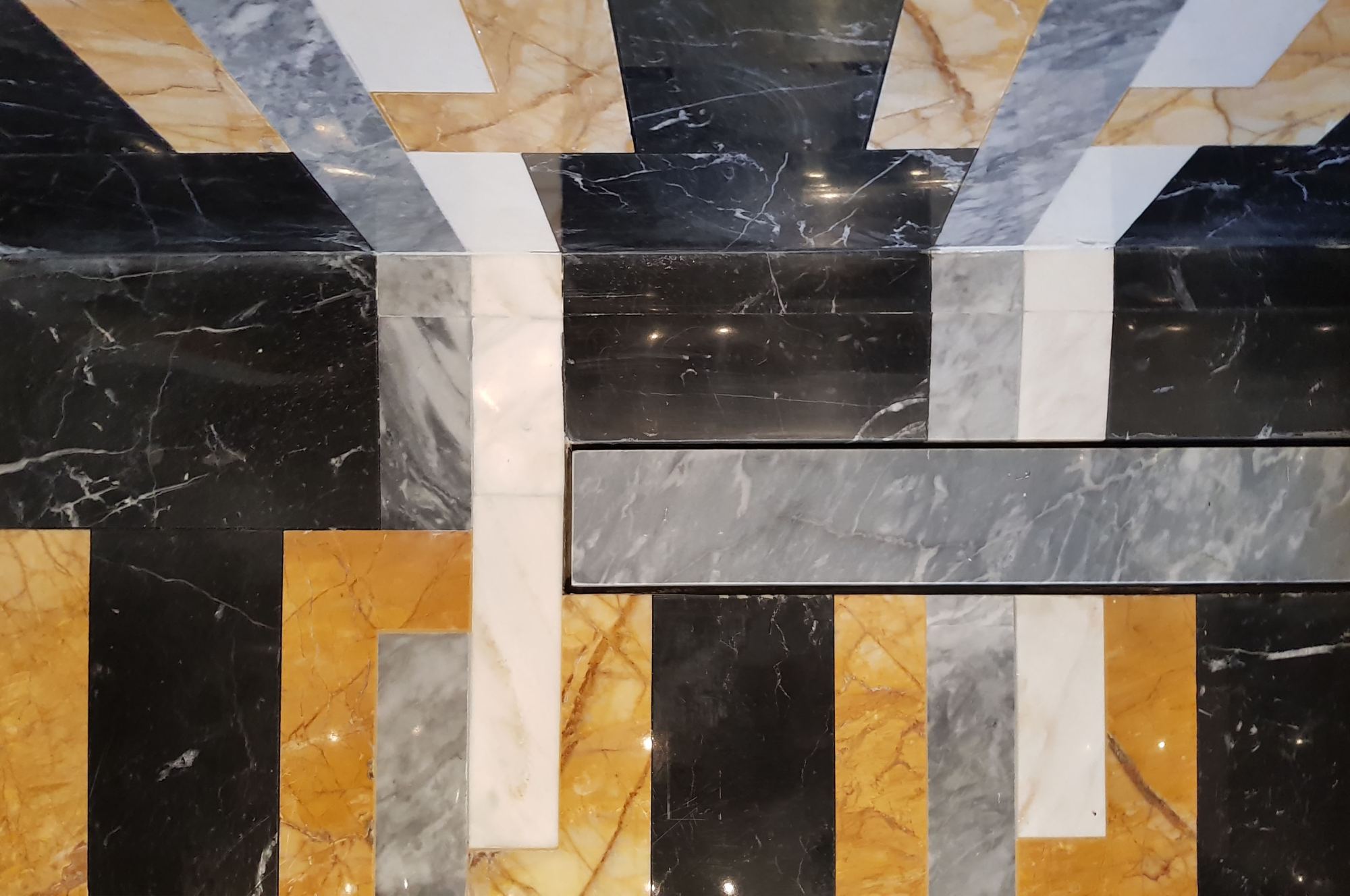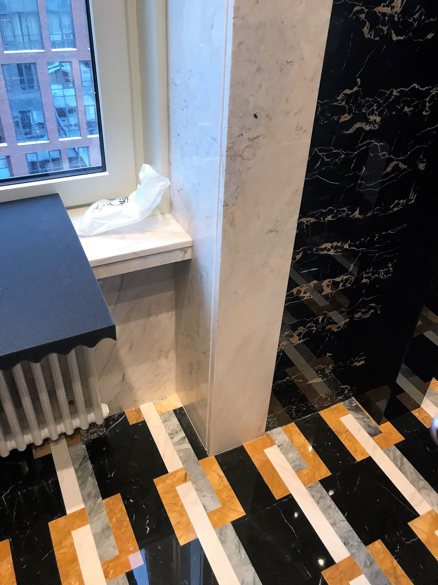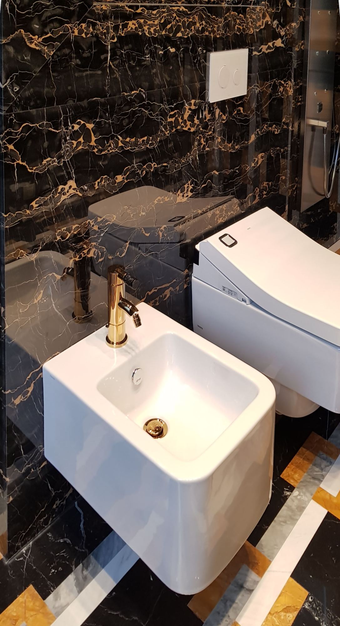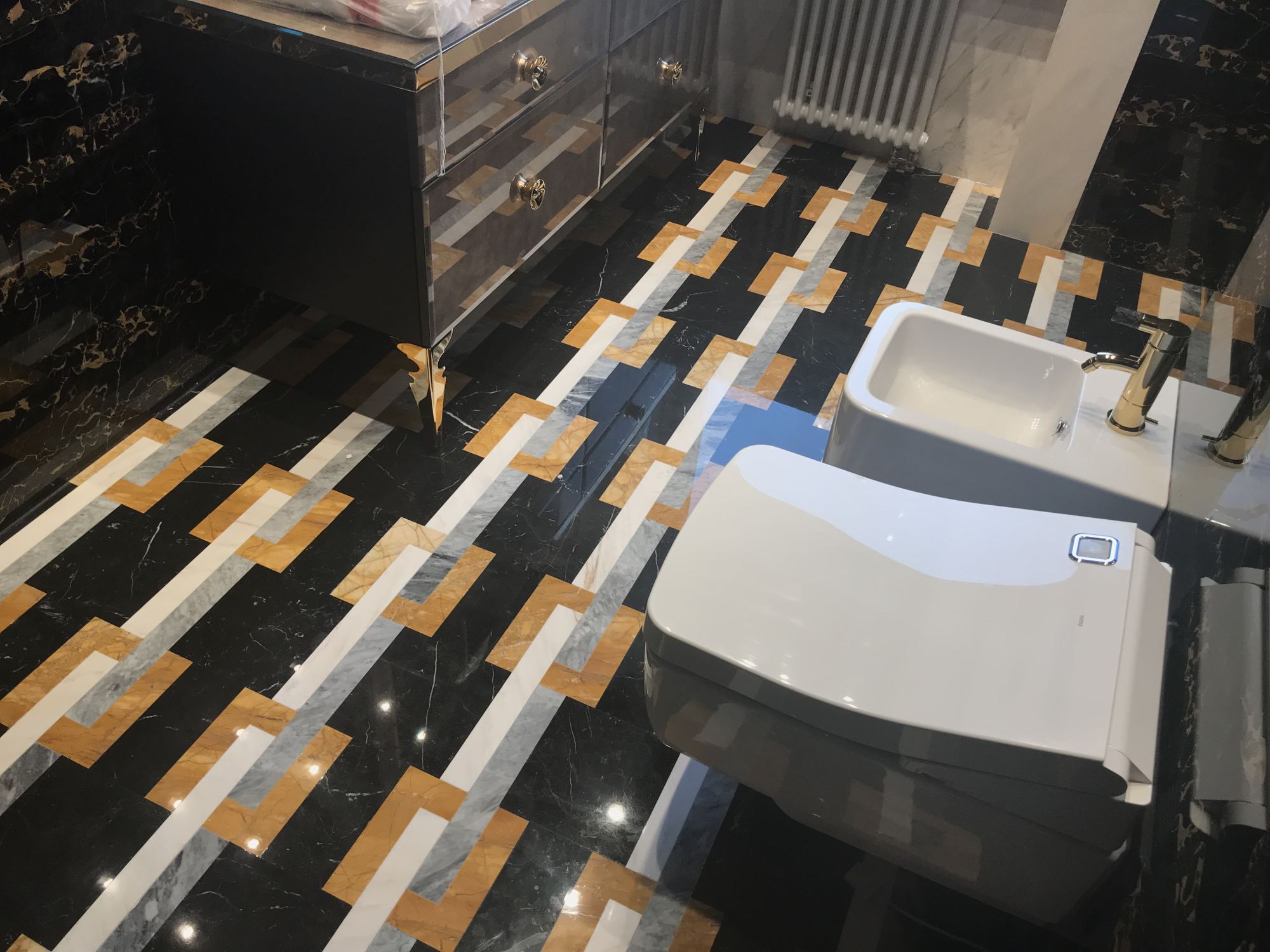 Базовой палитрой стали черный и темно-коричневый цвета, они ассоциируются с роскошной дворцовой обстановкой. За счет того, что одинаковая каменная плитка переходит с пола на стены, формируется цельное интимное пространство с акцентным обозначением душевой зоны. Данный участок выделен пестрым инкрустированным мрамором с геометрическим узором из белых, серых и желтых полос. Стальная матовая текстура душевого оборудования прекрасно сочетается с насыщенными цветами природного покрытия.
