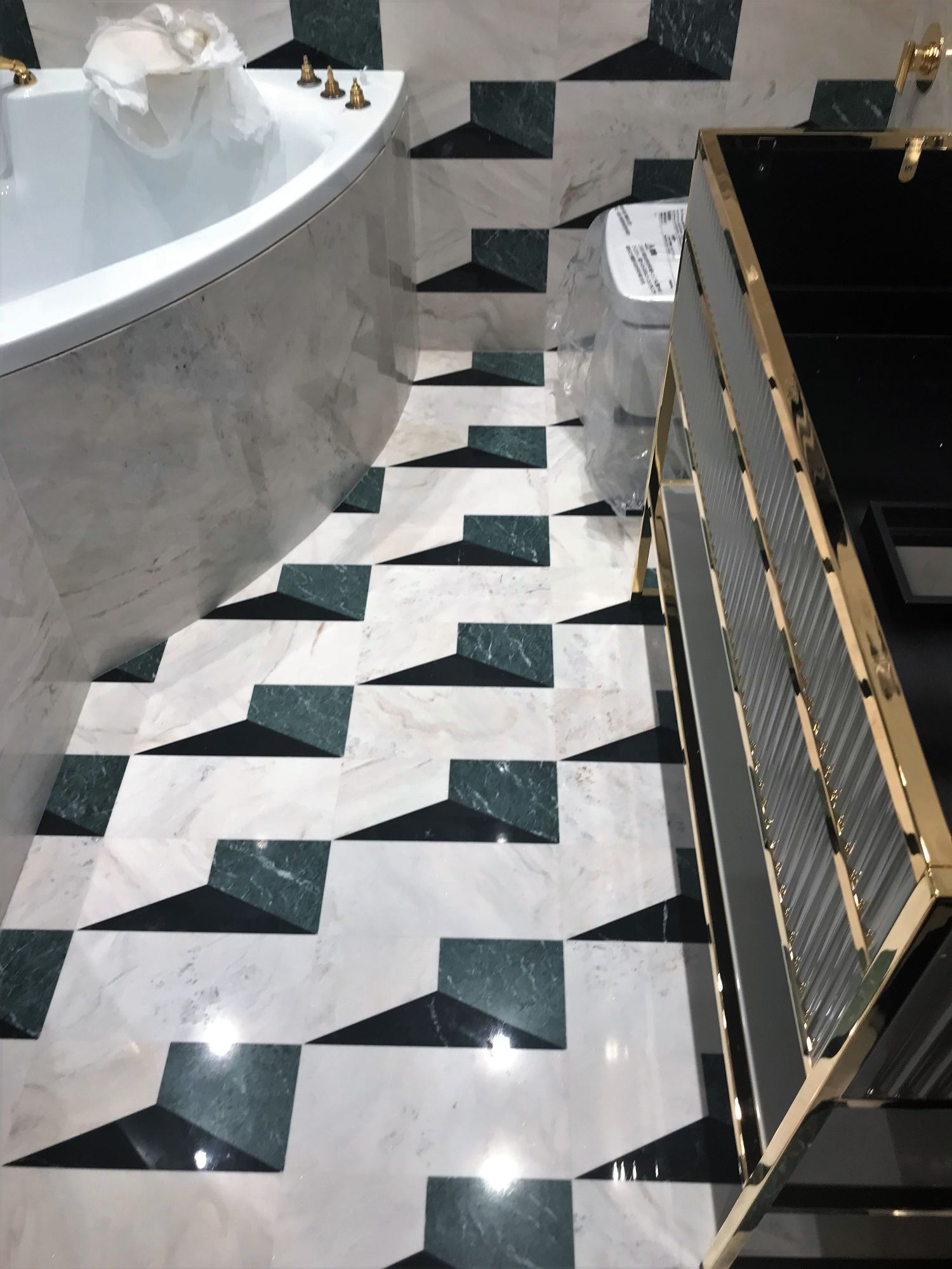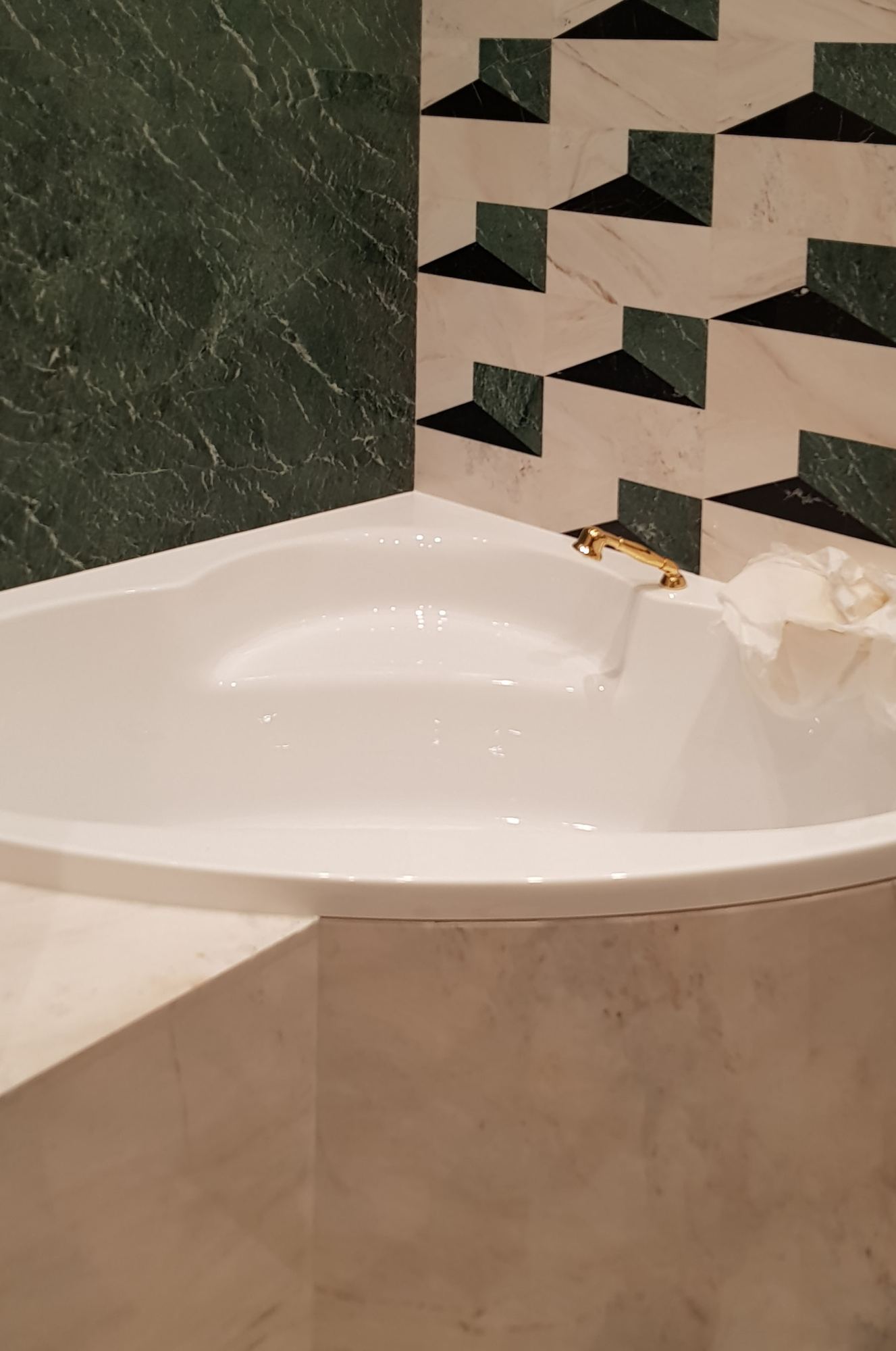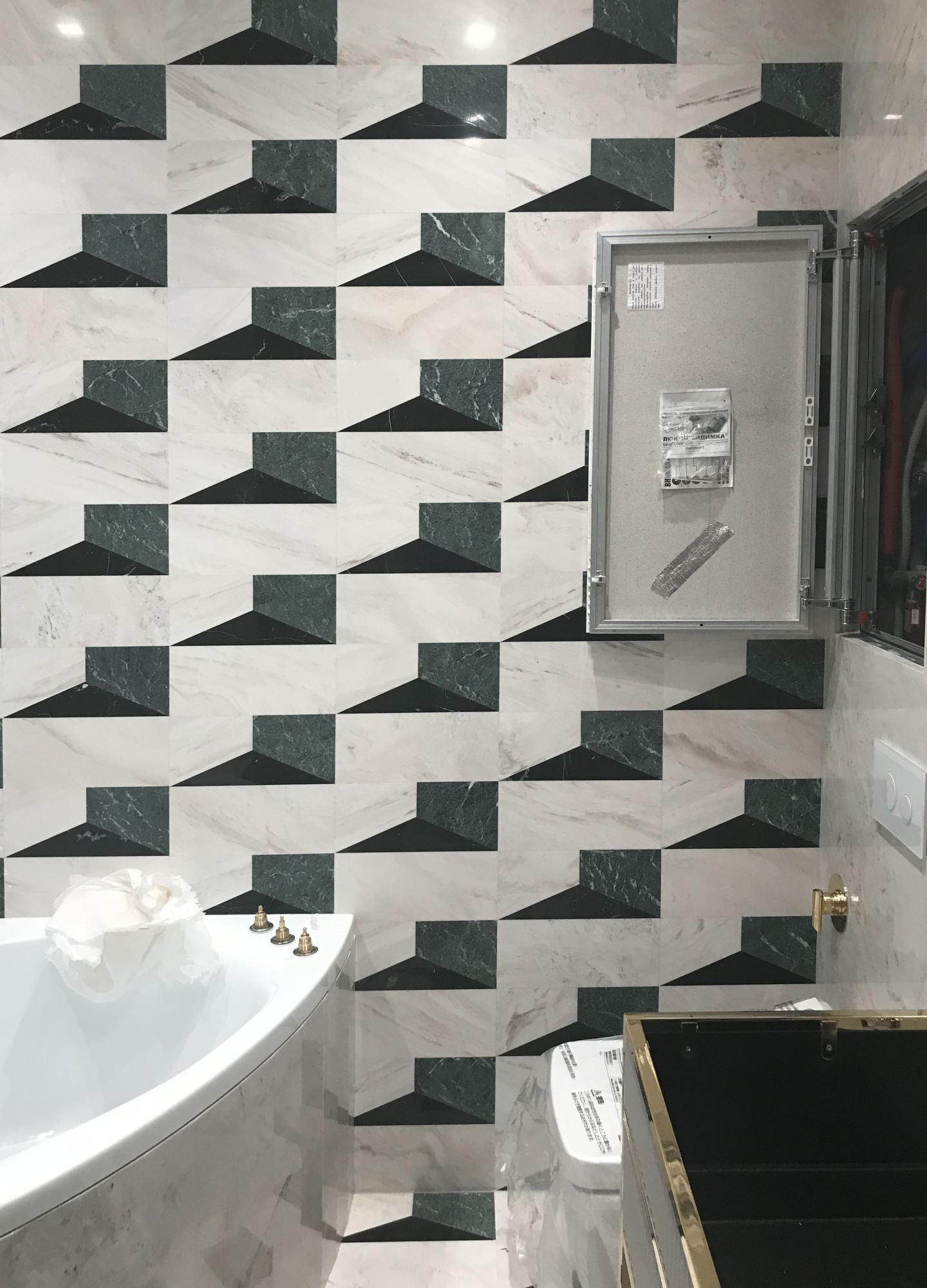 - темно-зеленой плиткой обозначены поверхности в душевой зоне и над угловой ванной;