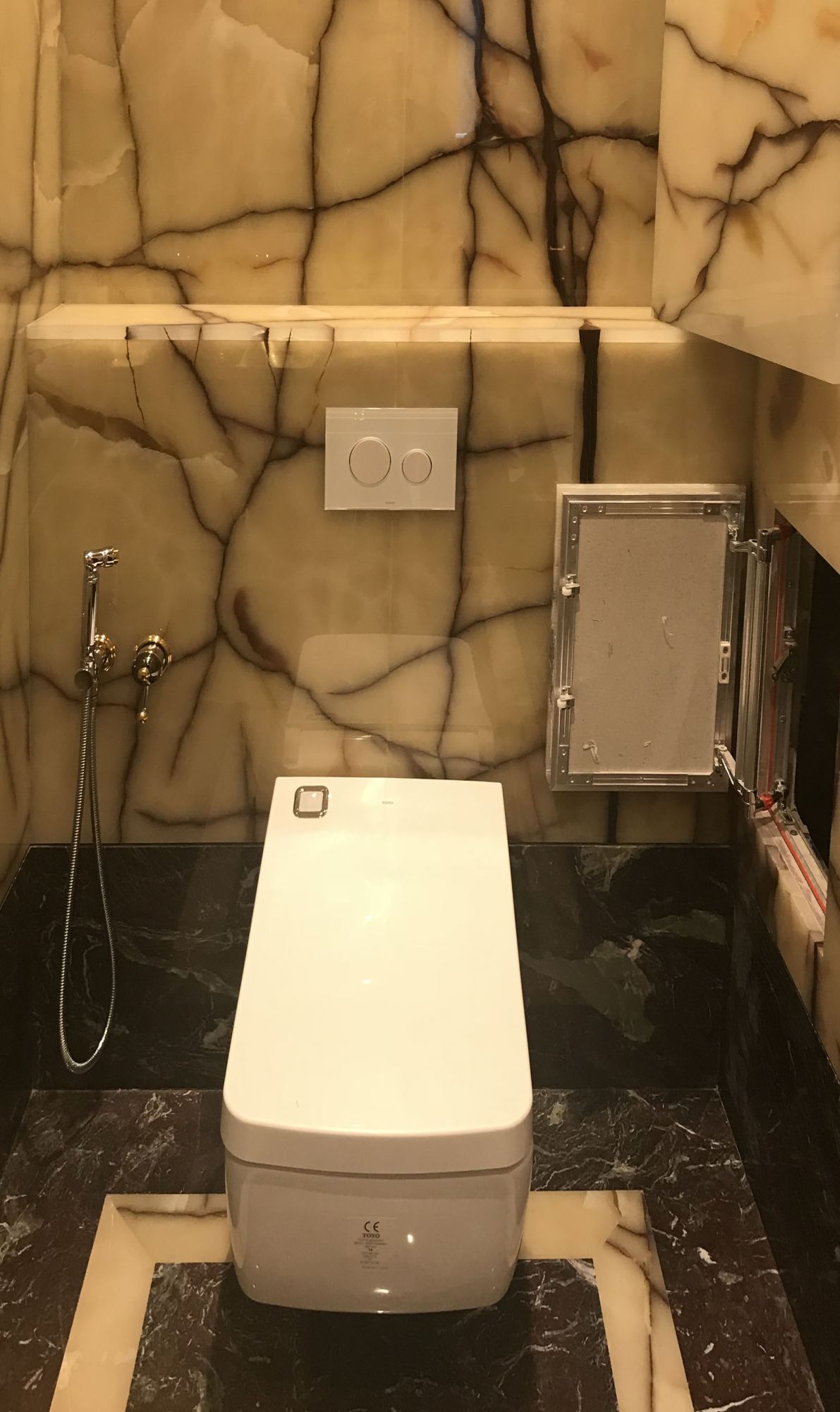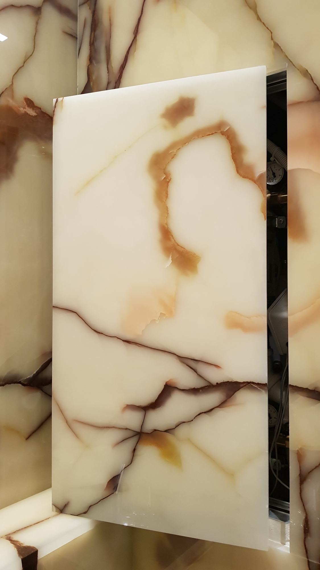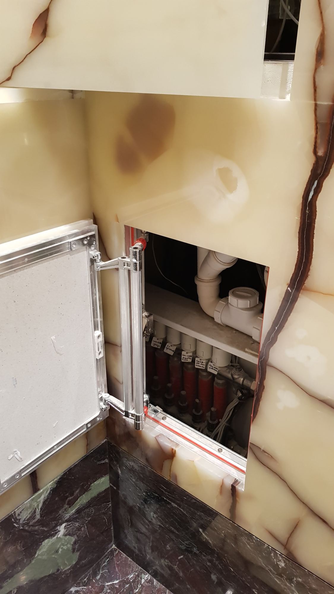 Техническую нишу с коммуникациями прикрывает люк-невидимка, снаружи облицованный каменной панелью. Точная разметка и грамотная последовательность ремонтных работ позволила аккуратно вывести провода для системы освещения сквозь каменную обшивку.