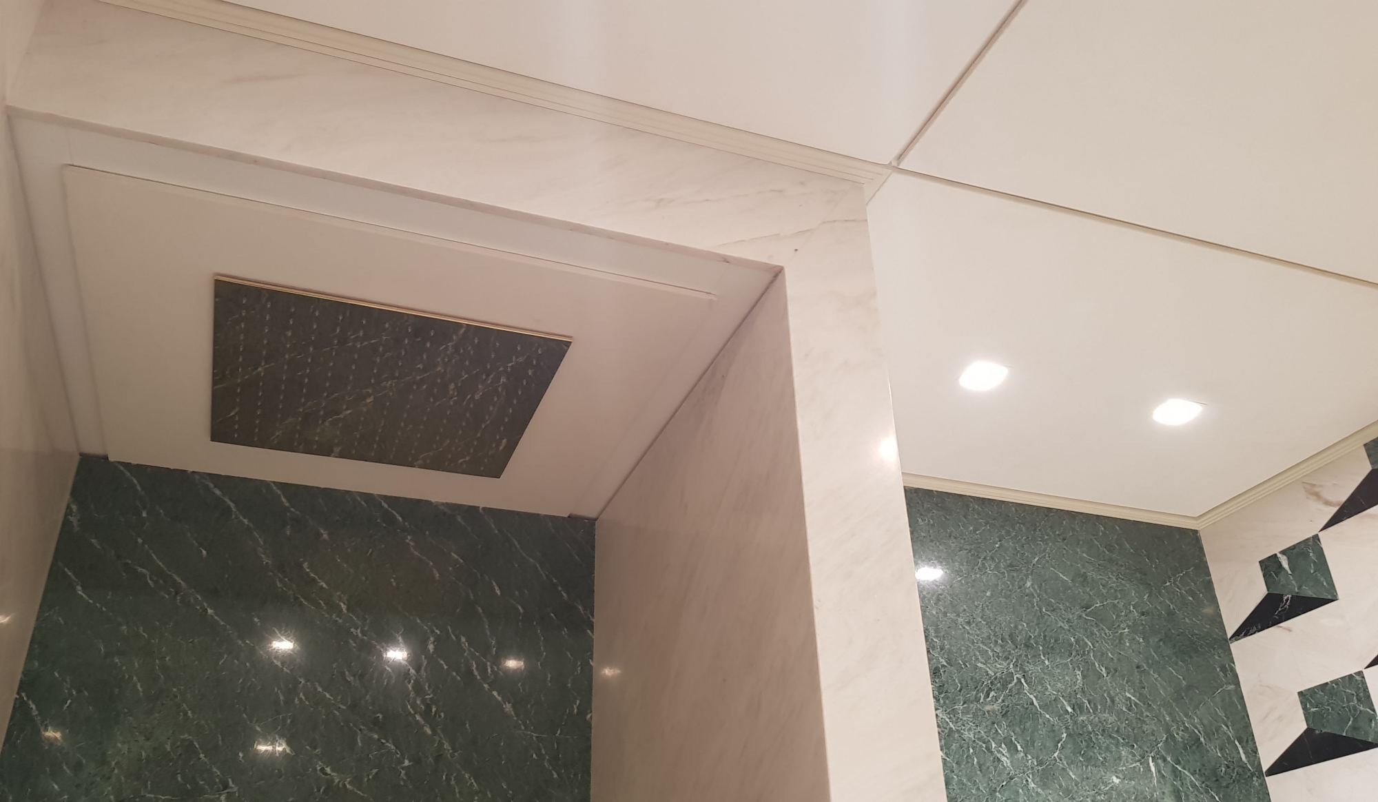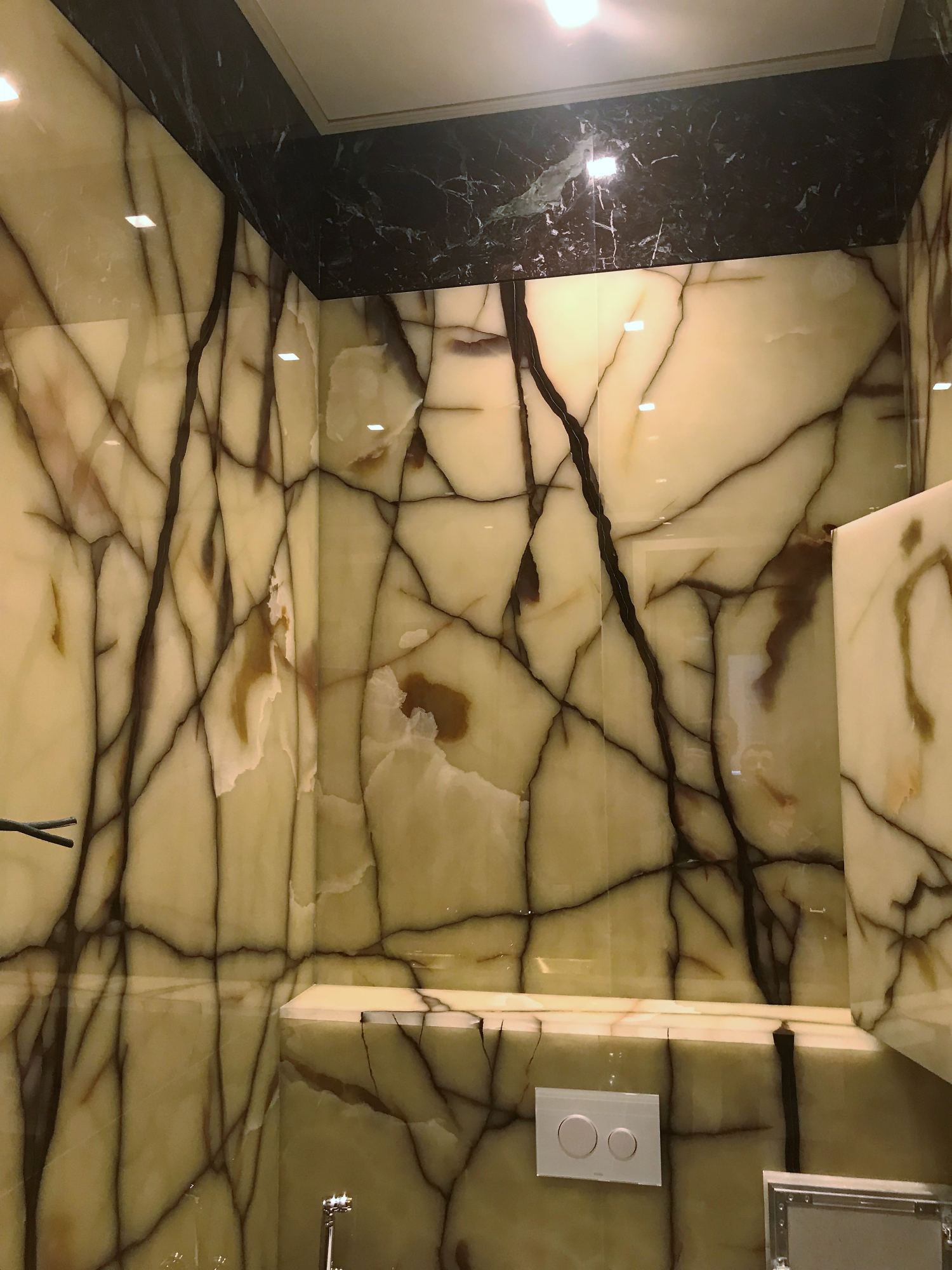 Планировка предусматривает несколько ванных комнат. Комбинирование мрамора разных цветов производит во втором хозяйском санузле зонирование:
