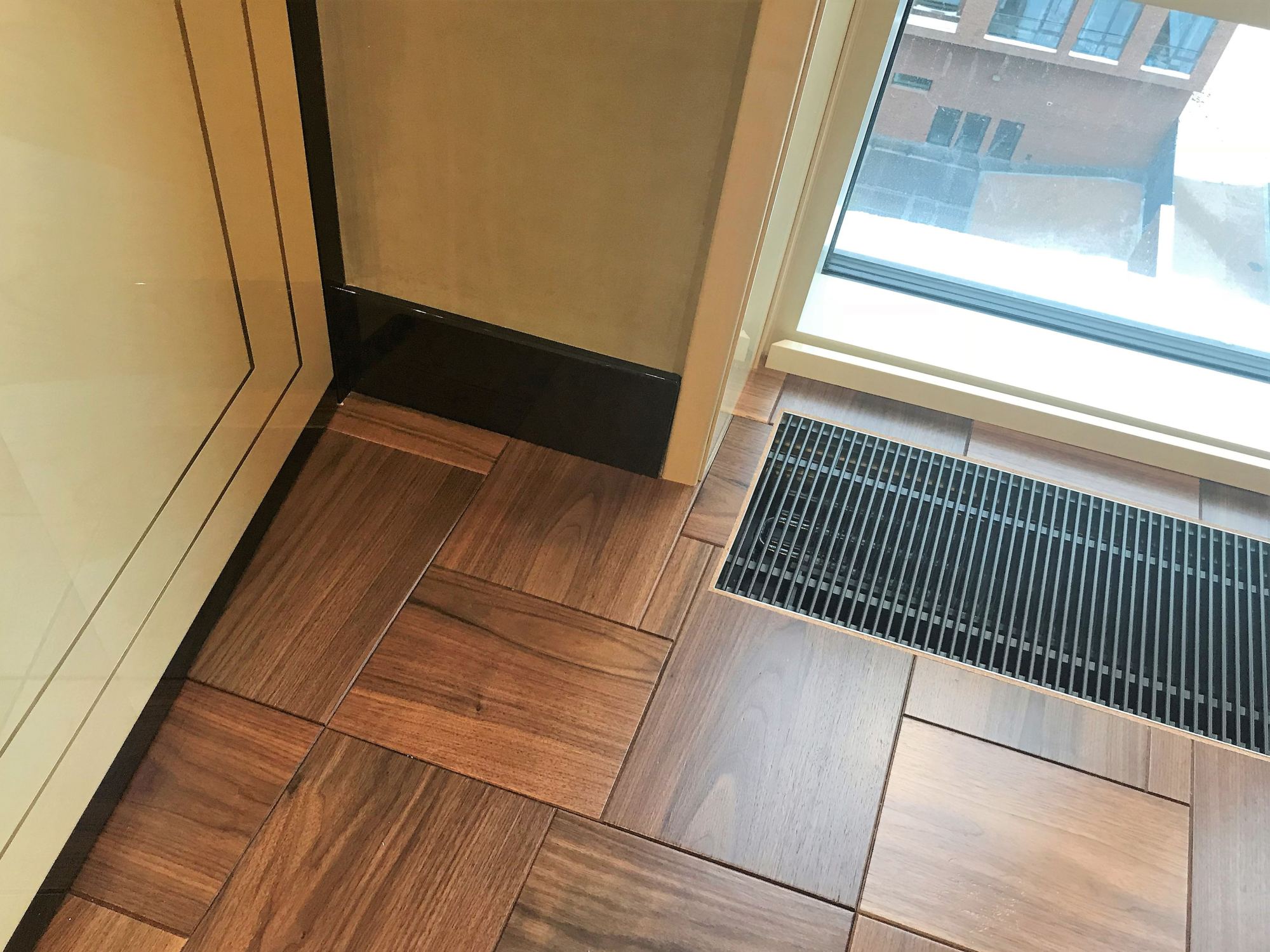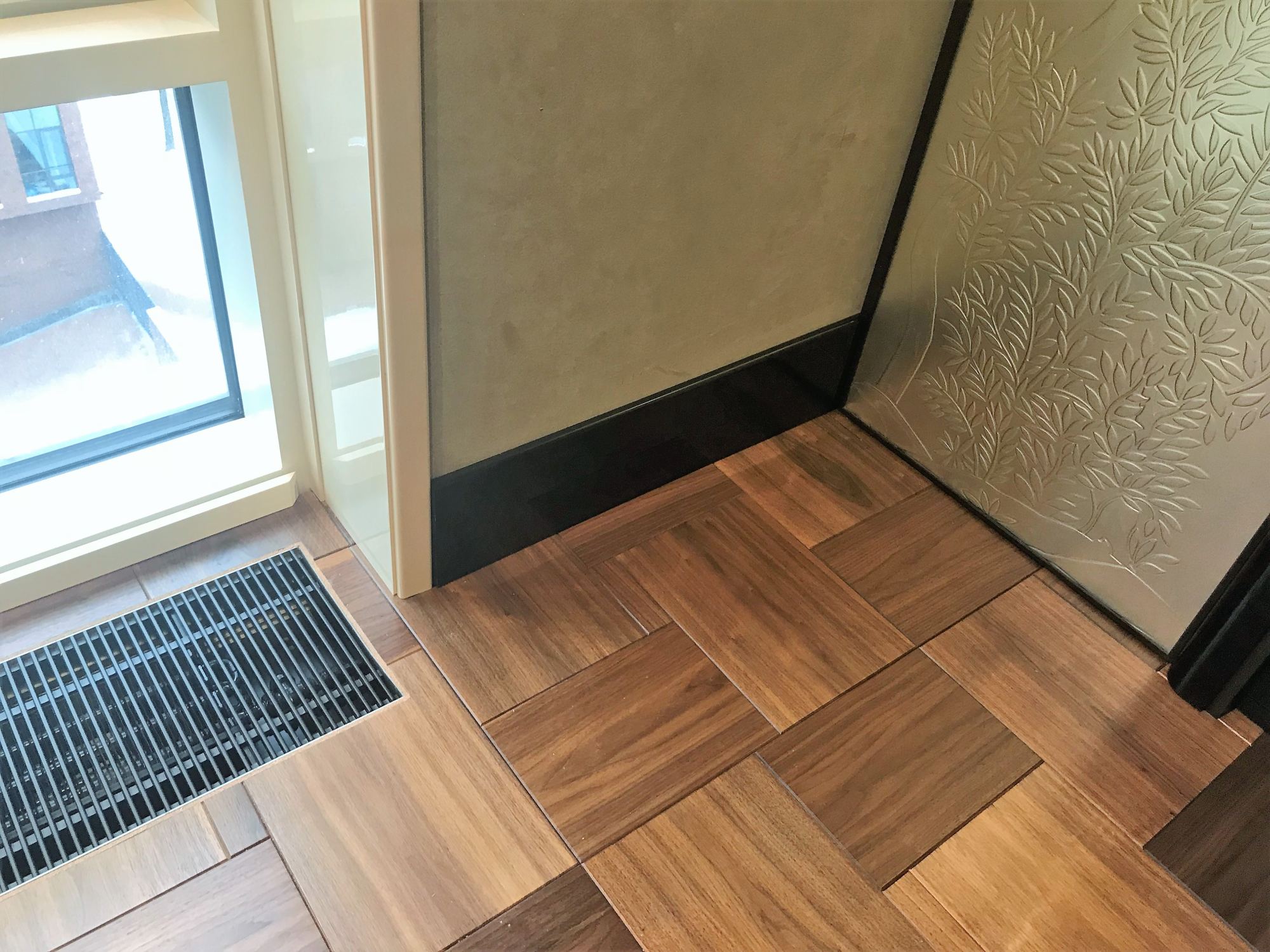 В ходе ремонта и отделки интерьера квартиры были решены технические задачи. В частности монтаж вентиляционной решетки в паркетный пол.