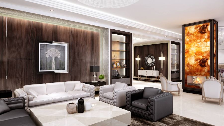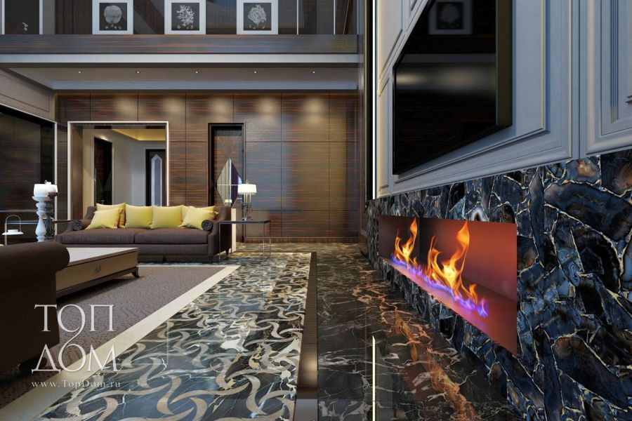 Традиционный материл для завершающей отделки стен в ванной комнате, санузле, прачечной, фартука на кухне. Хорошо переносит перепады температуры, создает цветовые и орнаментальные акценты. Для гостиных применяют крупноформатную плитку из мрамора, керамогранита, терракоты с незаметными швами – гладкая ровная поверхность расширяет внутреннее пространство помещения. Возможно точечное использование для акцента зоны камина или телевизора.