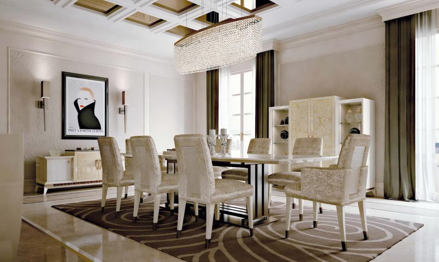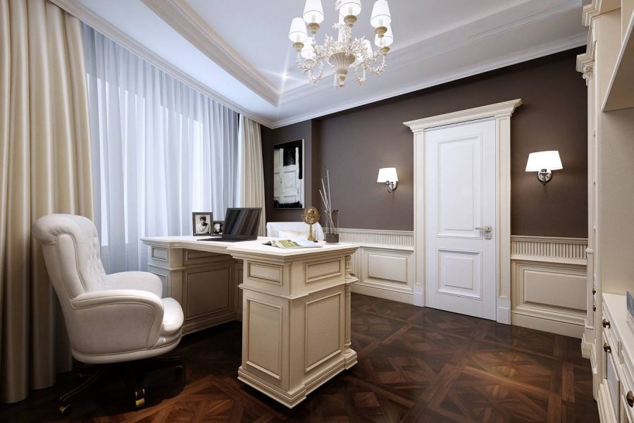 - Потолки оформлены широкими плинтусами с рельефной резьбой. Стилистически их рисунок поддерживают белые стеновые панели, украшенные орнаментальными молдингами.