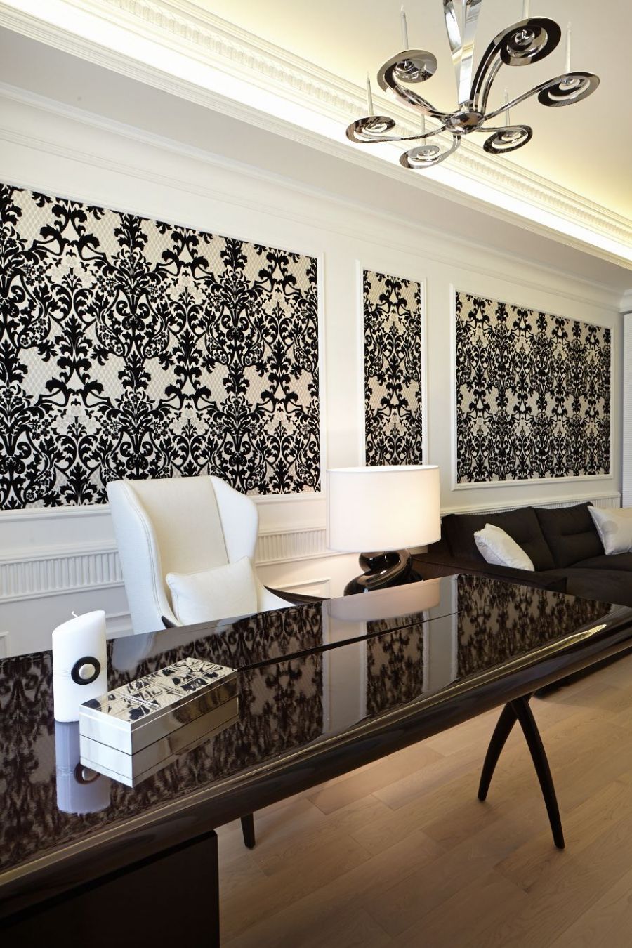 - Прямоугольные буазери с объемным цветочным декором акцентируют внимание на симметричном дизайне стен и белой цветовой гамме, которая придает обстановке классическую парадность.