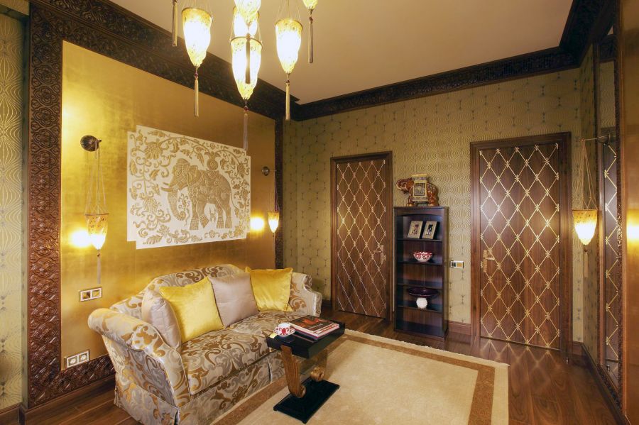 - Оформление дверных проемов включило декор литыми бронзовыми аппликациями на межкомнатных дверях и конструирование белого портала с позолоченной окантовкой в общественной части интерьера.