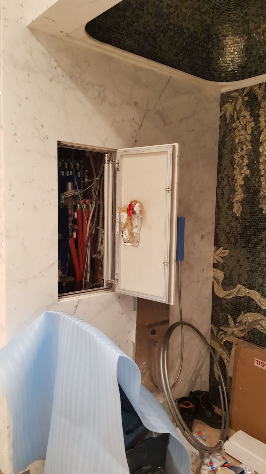В дизайне санузла всегда встает вопрос практичного и красивого оформления технического отсека. Конструкция настенного люка-невидимки позволяет выдерживать нагрузку от облицовочного материала (в данном случае – мрамора) и сохраняет гармонию интерьерного пространства.