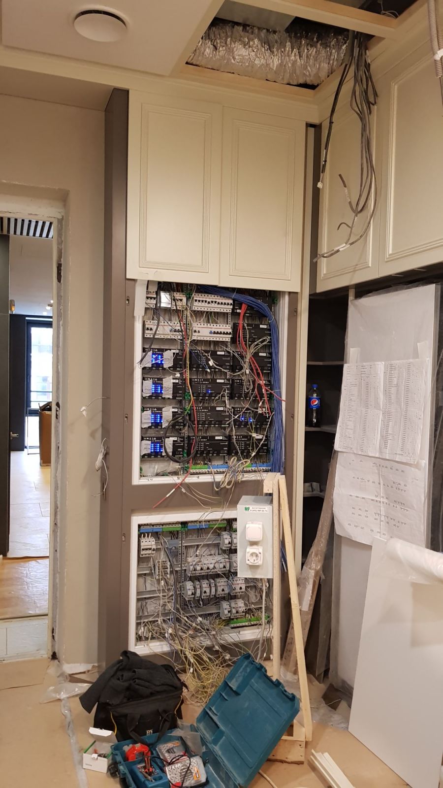 Параллельно с финишной отделкой стен и остальных поверхностей были реализованы технические решения. Инженеры «ТопДом» смонтировали внутри квартиры распределительный электрический шкаф. Он делает безопасной эксплуатацию домашней электросети, защищает проводку и бытовую технику от коротких замыканий, контролирует нагрузку от мощных приборов: стиральной машины, кондиционера, бойлера. Заказать электропроект с учетом пожеланий заказчика, технических условий на объекте и последующим согласованием вы можете в нашей компании.
