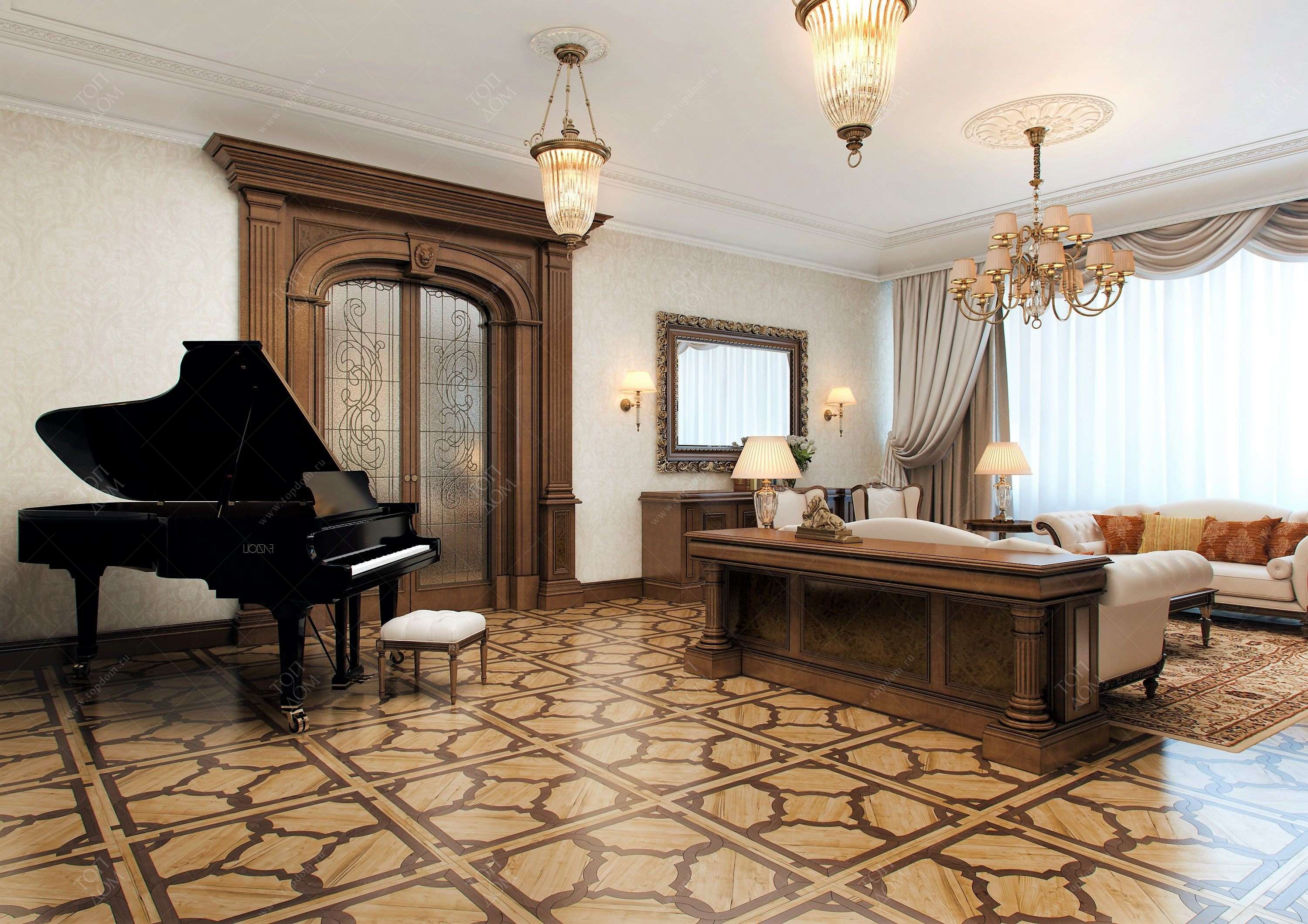 Процесс ремонта под ключ в классическом стиле включил тщательную черновую и чистовую подготовку поверхностей в каждом помещении. При реализации дизайн-проекта на этапе финишной отделки команда «ТопДом» использовала следующие приемы: