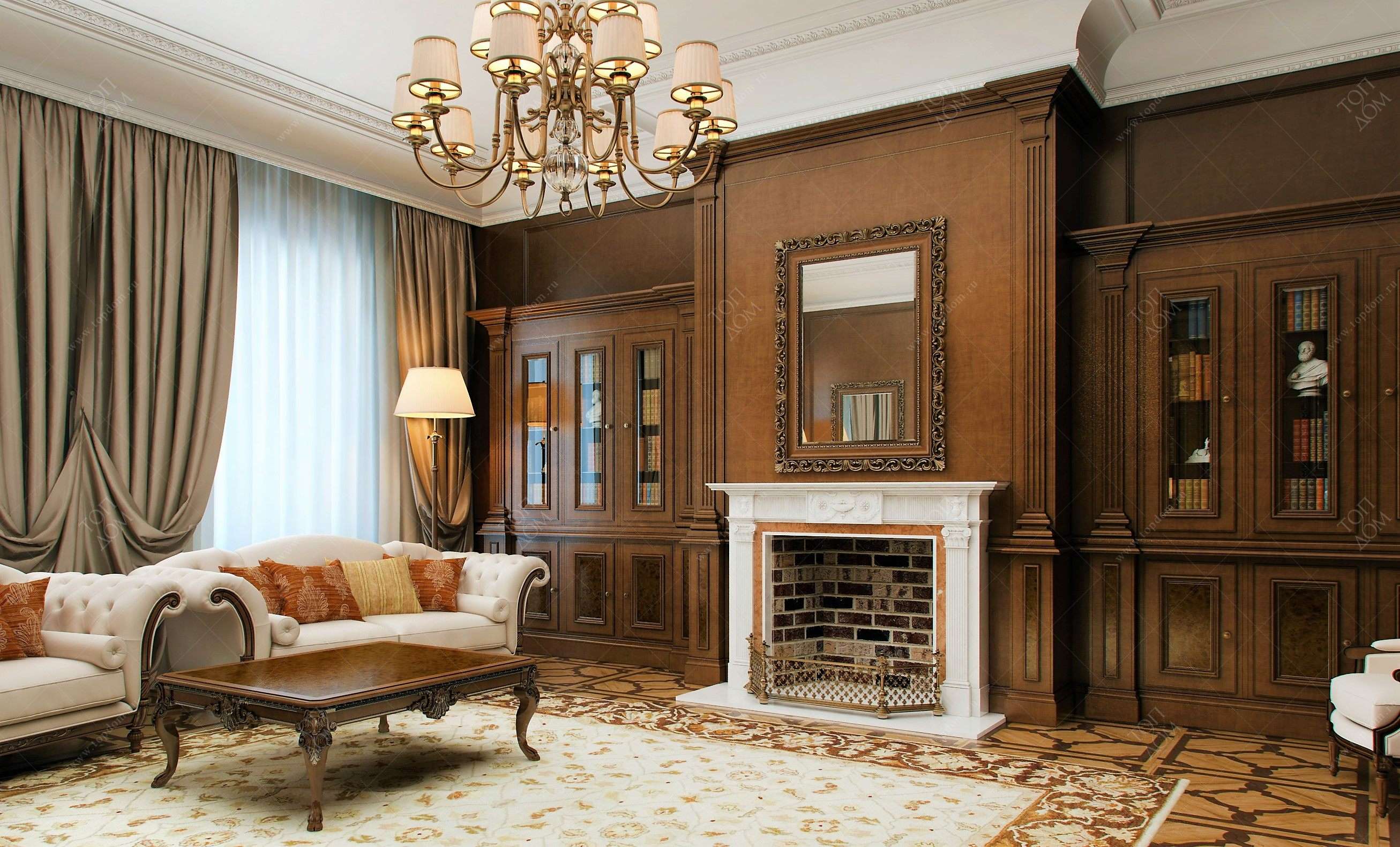 Деревянные панели – универсальный прием для разной стилистики. Если в современных интерьерах можно обойтись без украшений, то в классических подчеркиваются резные элементы, позолота, комбинация с обоями.