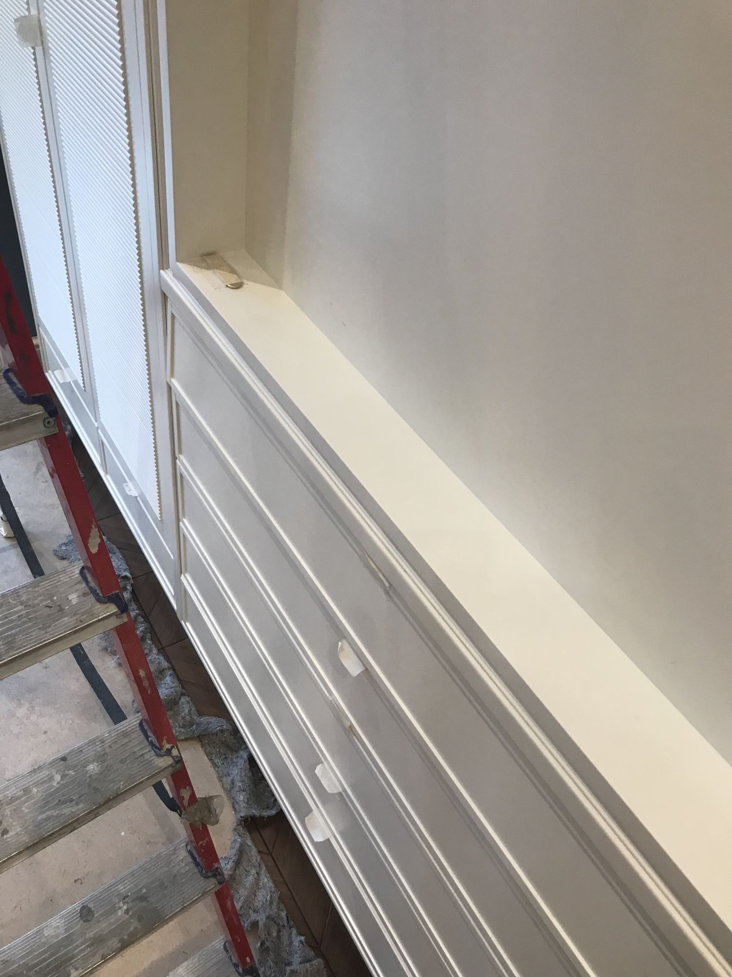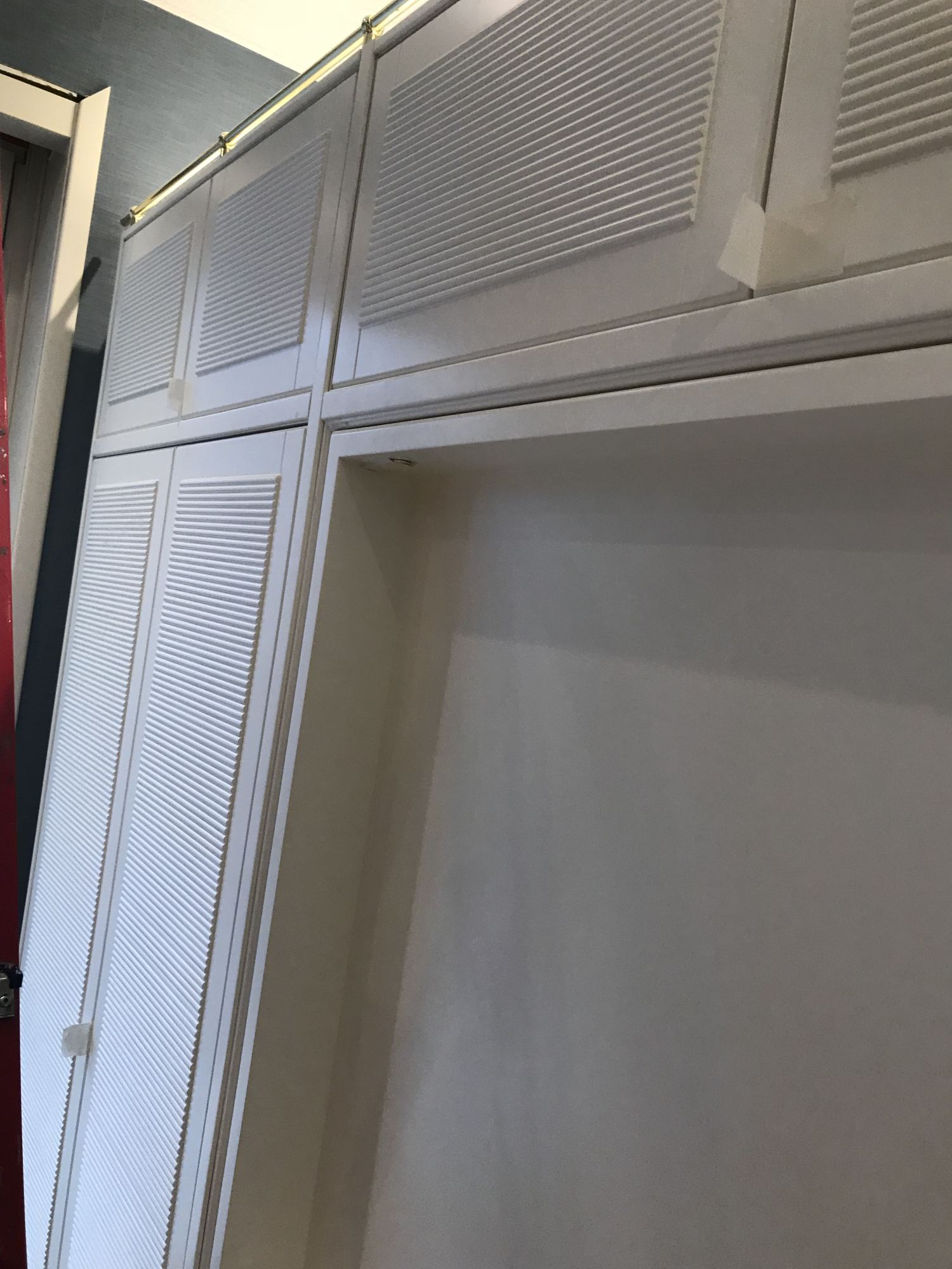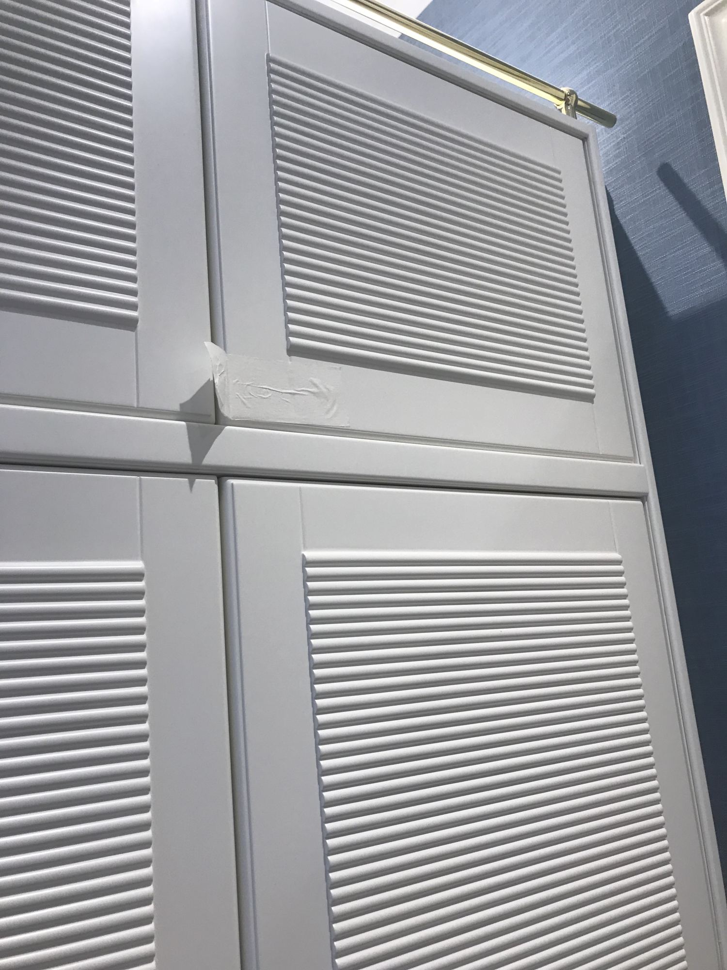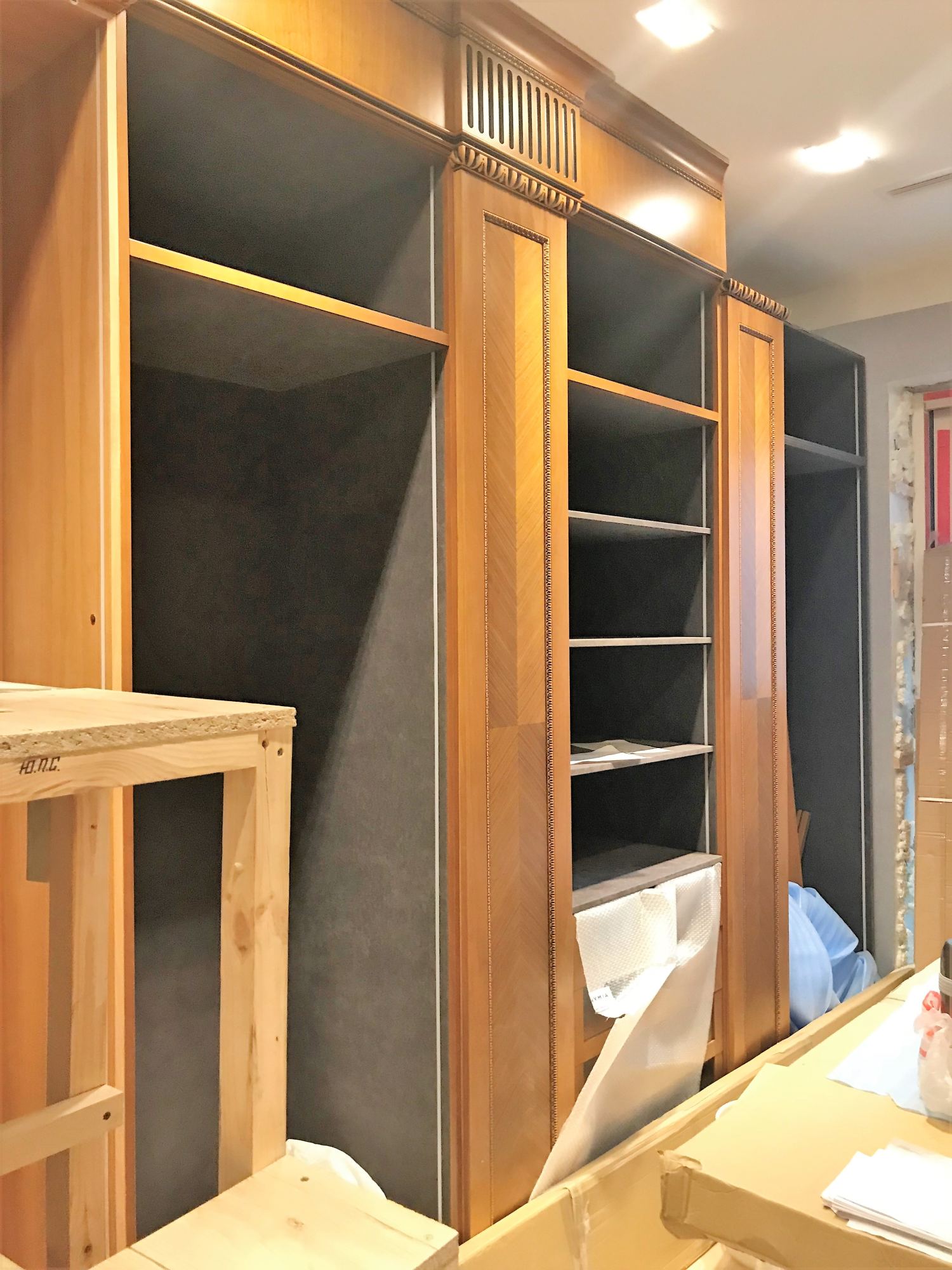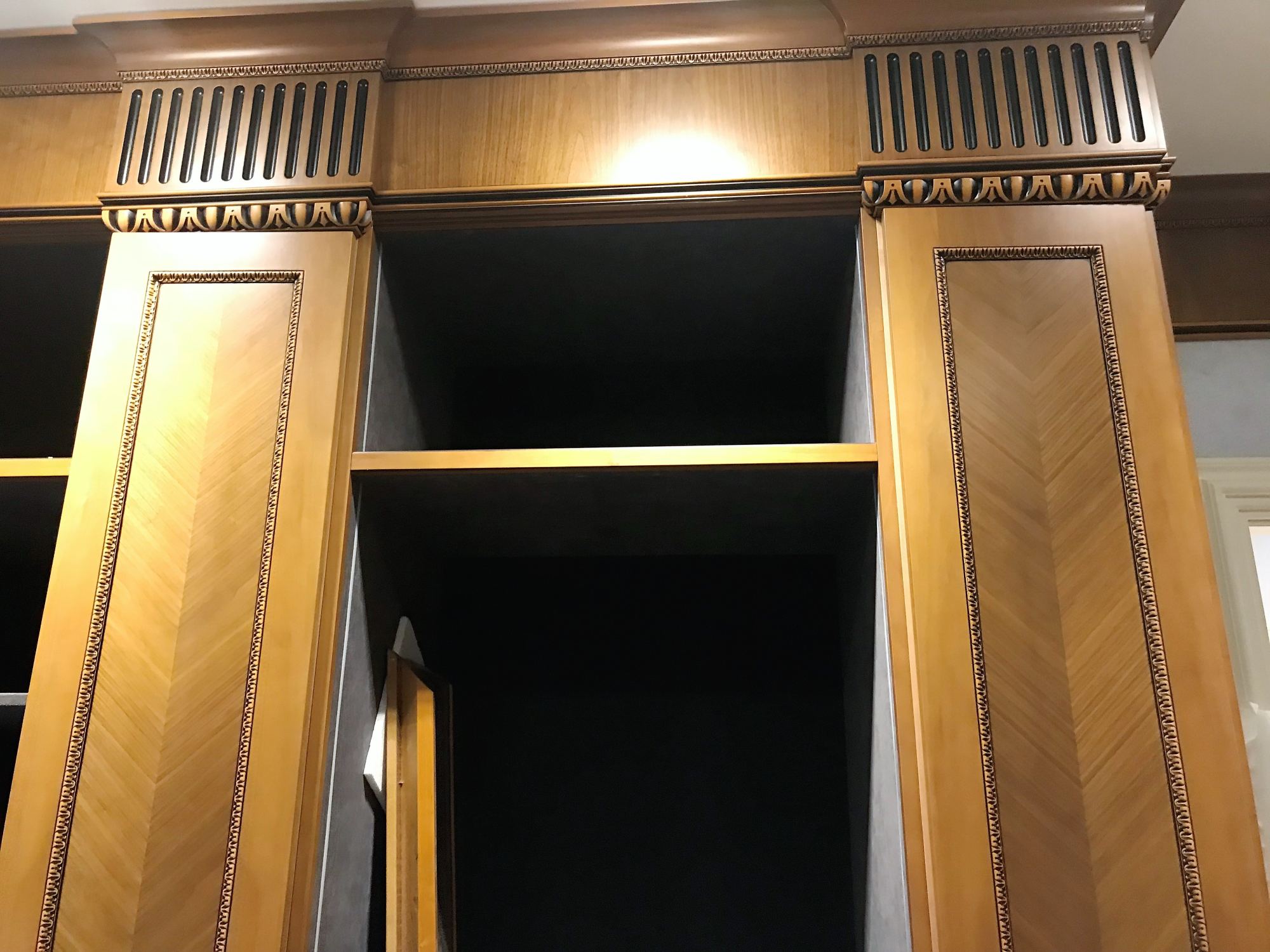 - Смонтированы встроенные шкафы с резными фасадами орехового оттенка, белоснежная мебель с нишей и рифлеными дверцами.