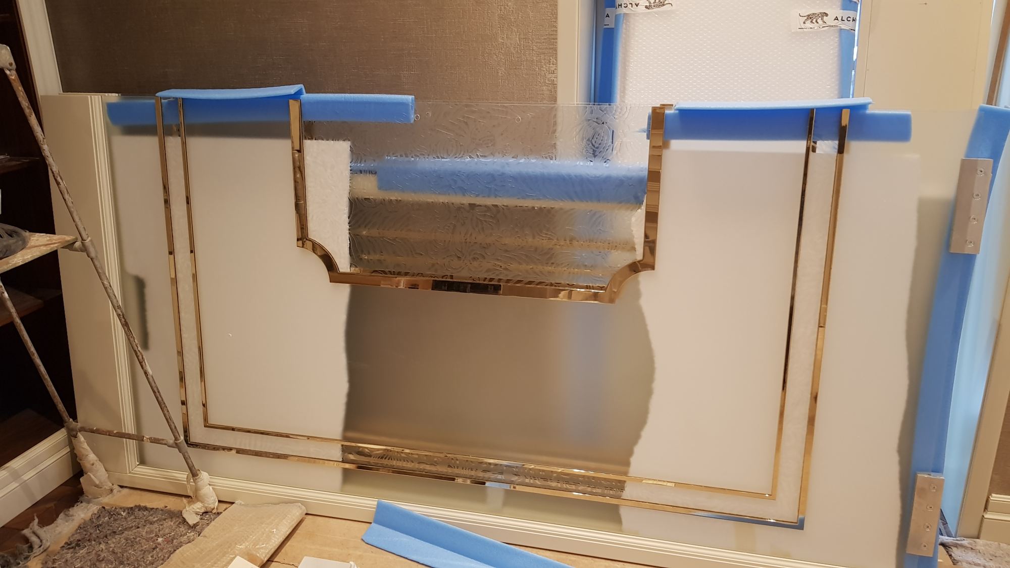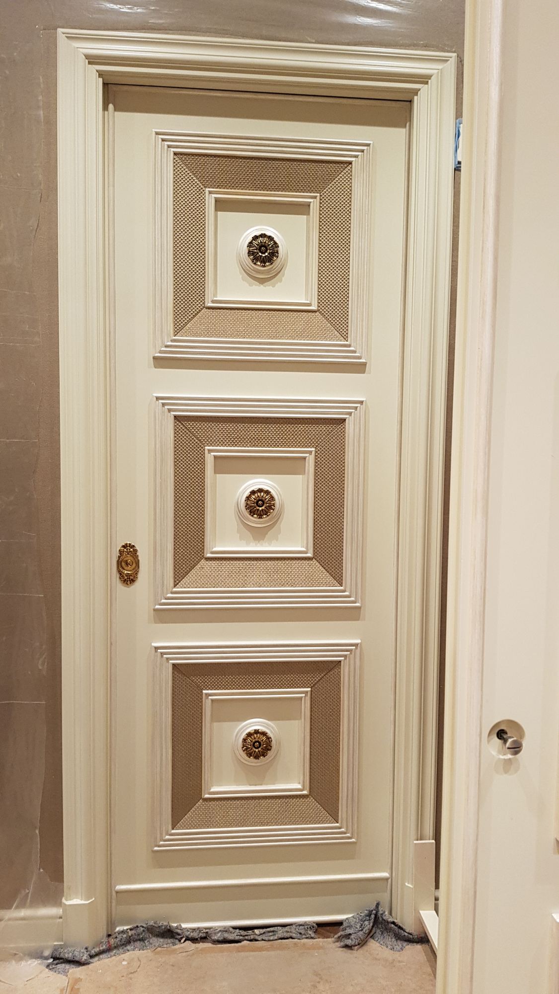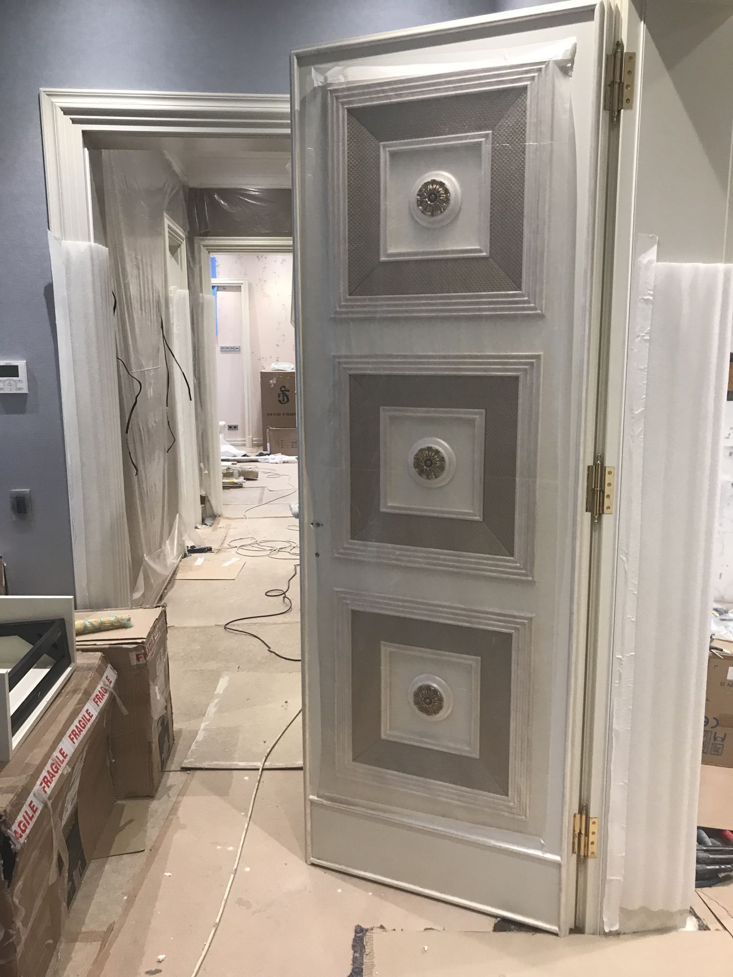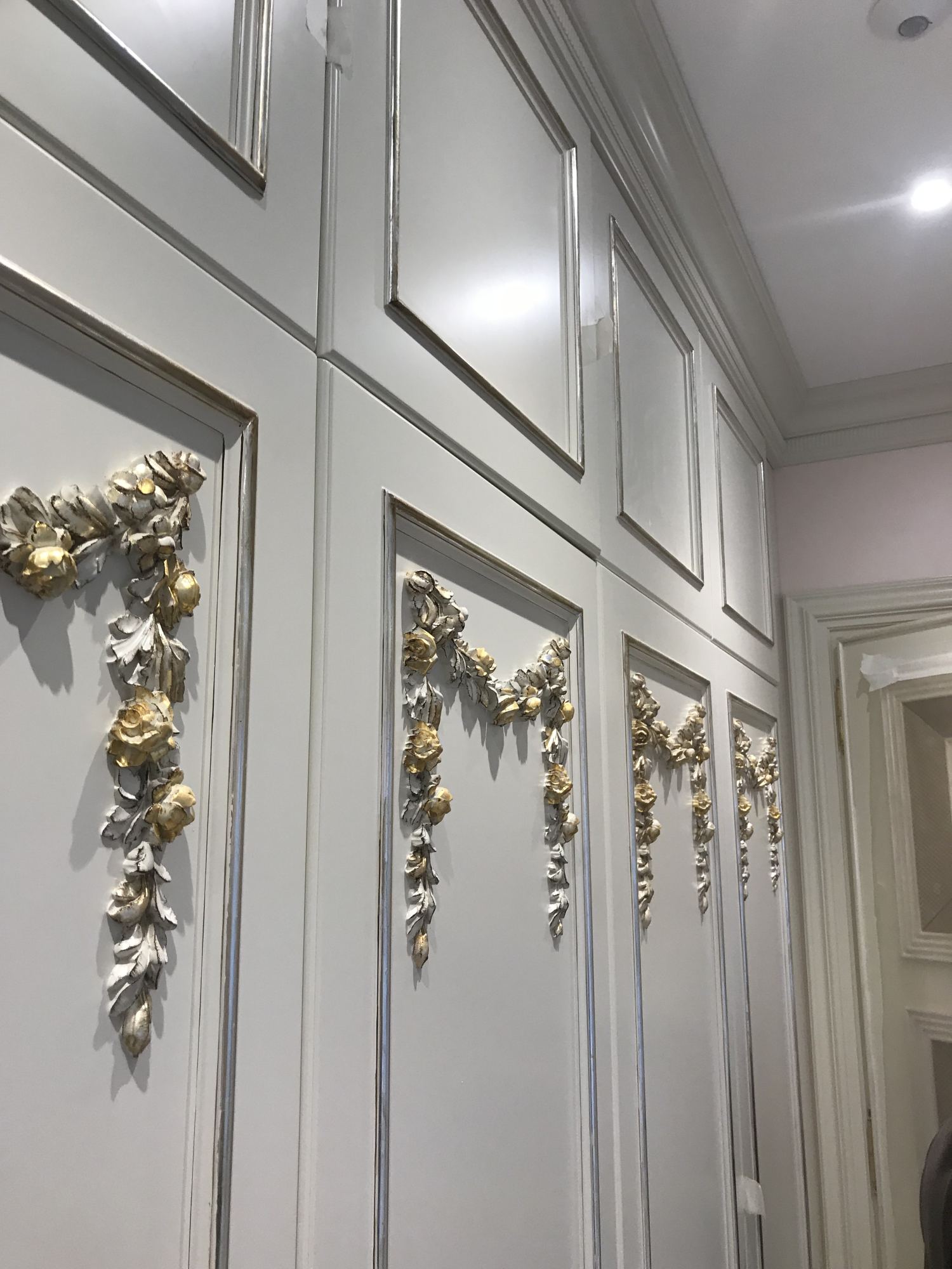 - Оформление дверных проемов включило декор литыми бронзовыми аппликациями на межкомнатных дверях и конструирование белого портала с позолоченной окантовкой в общественной части интерьера.
