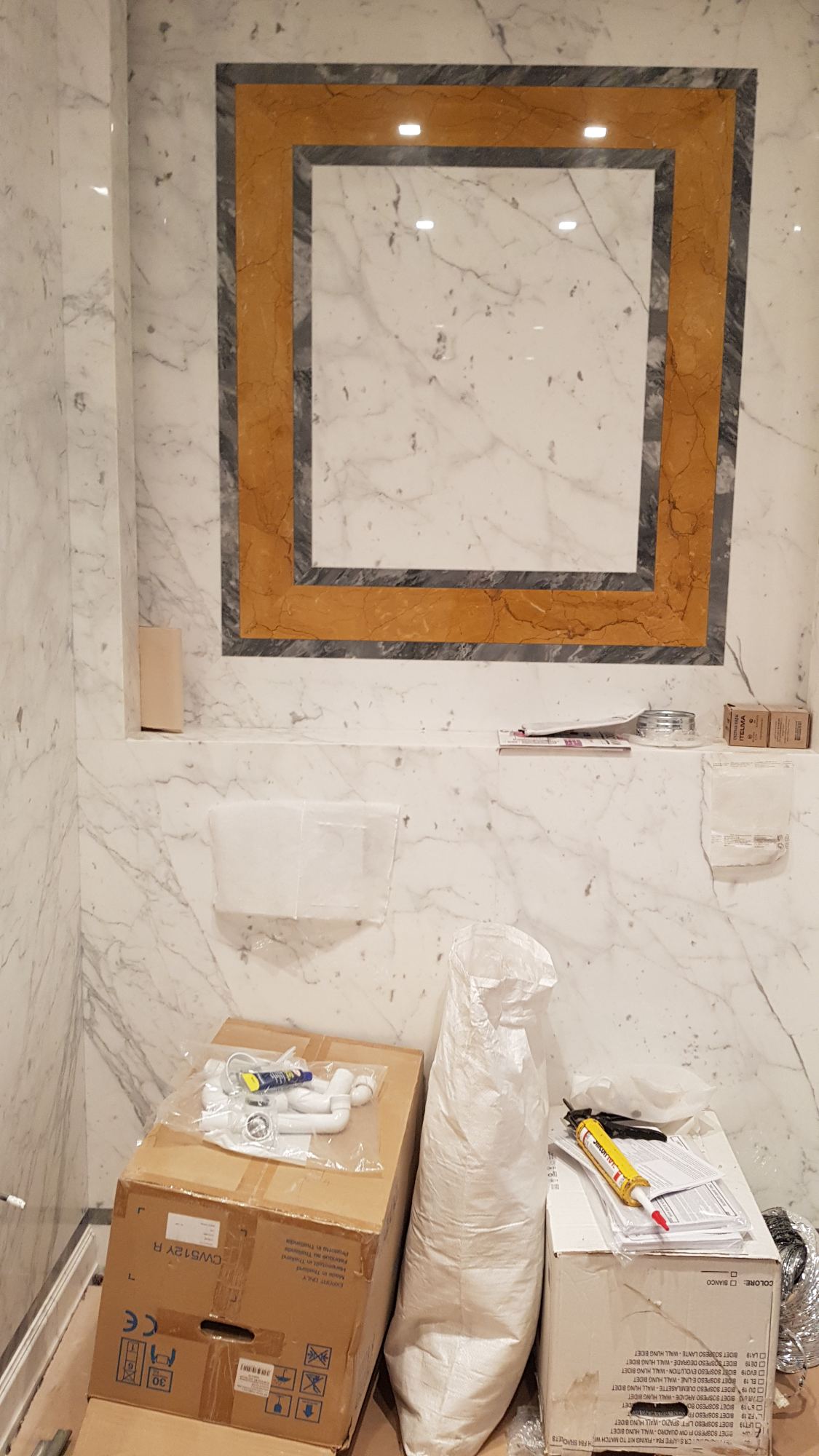 В дизайне санузла всегда встает вопрос практичного и красивого оформления технического отсека. Конструкция настенного люка-невидимки позволяет выдерживать нагрузку от облицовочного материала (в данном случае – мрамора) и сохраняет гармонию интерьерного пространства.