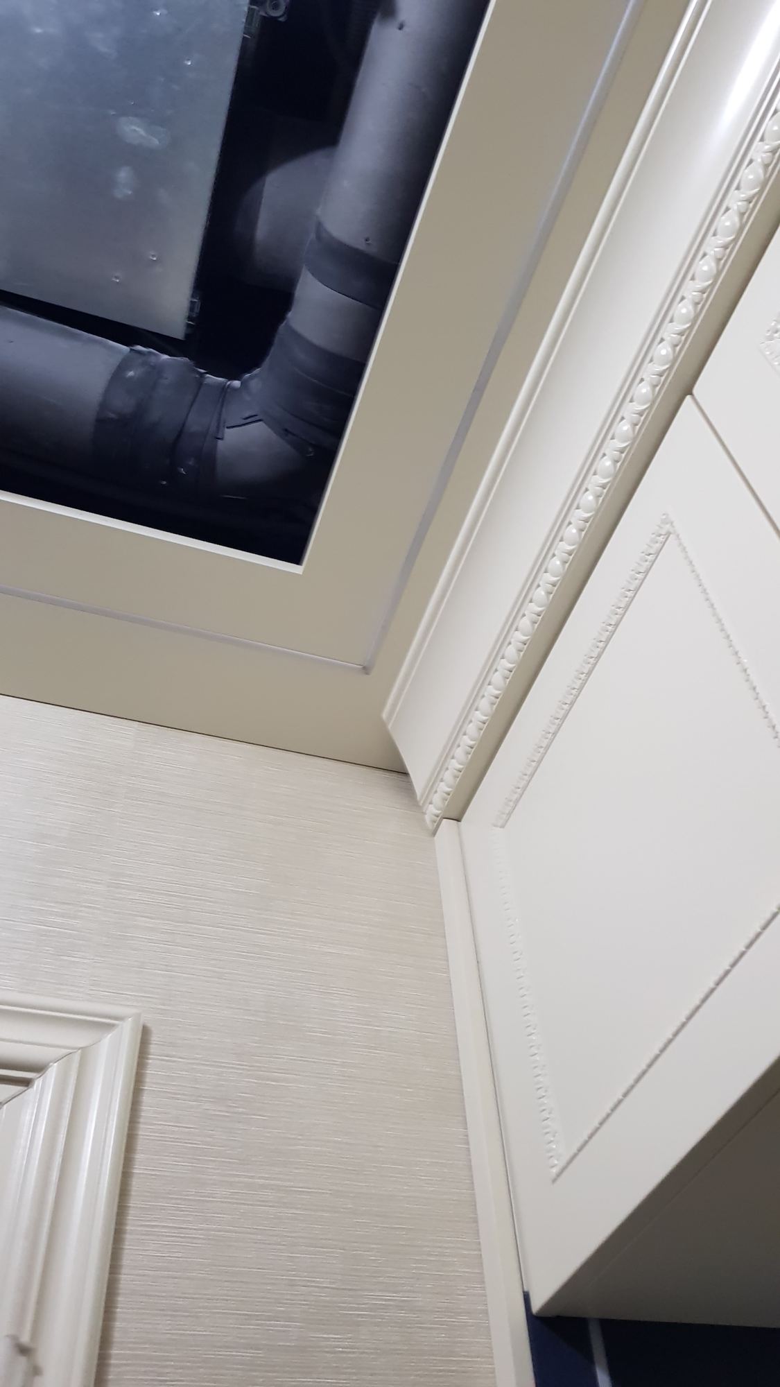 - Потолки оформлены широкими плинтусами с рельефной резьбой. Стилистически их рисунок поддерживают белые стеновые панели, украшенные орнаментальными молдингами.