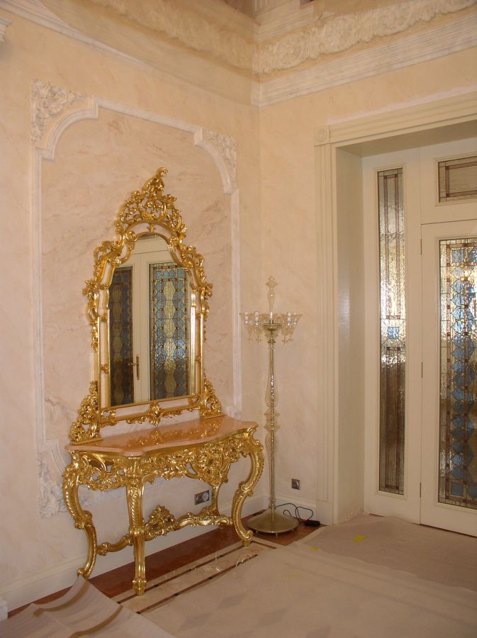 - Просторный холл акцентирует внимание на сияющих золотом зеркалах в пышном резном обрамлении. Они образуют ансамбль с такими же резными приставными столиками-консолями. Место их расположения выделено на стене композицией из фигурных молдингов.