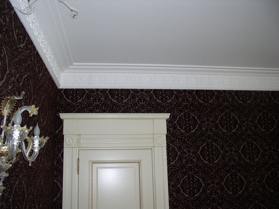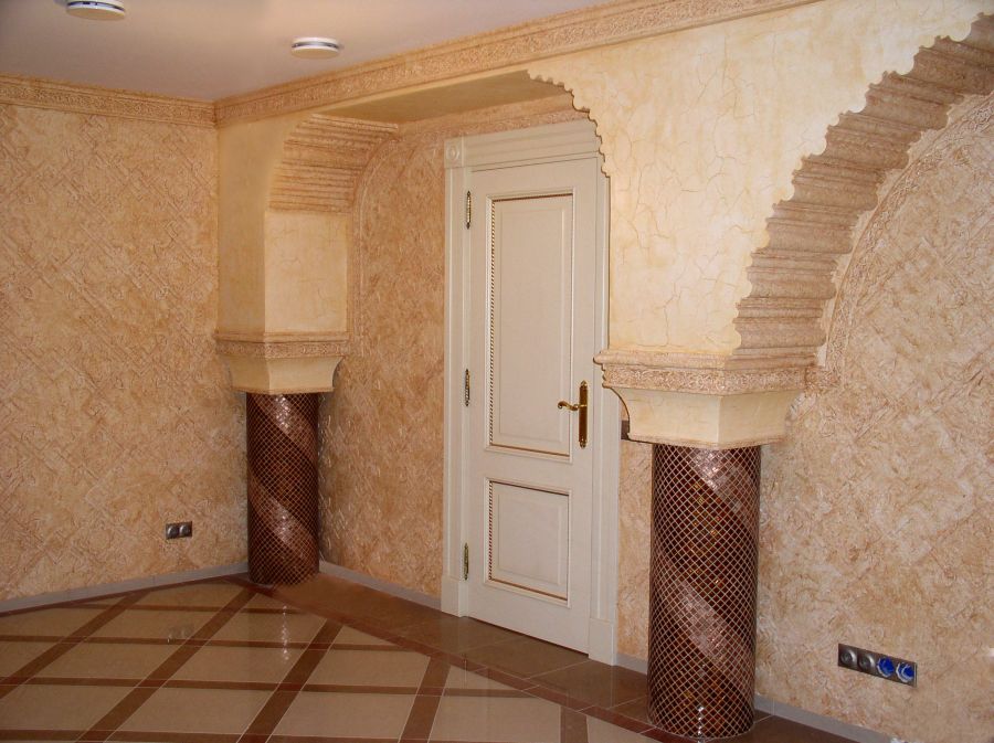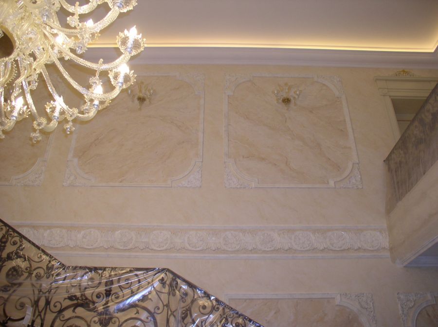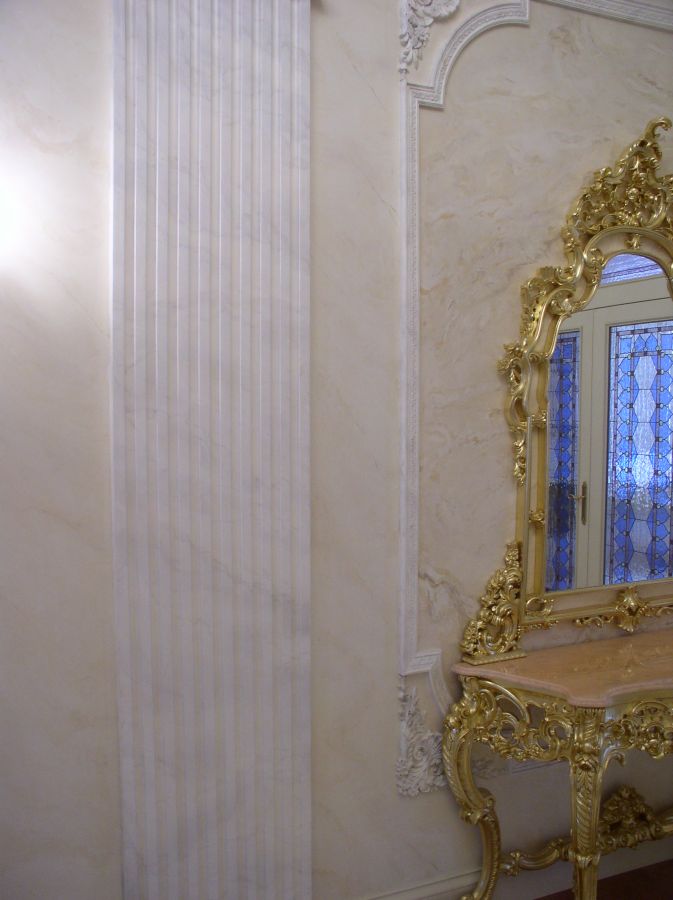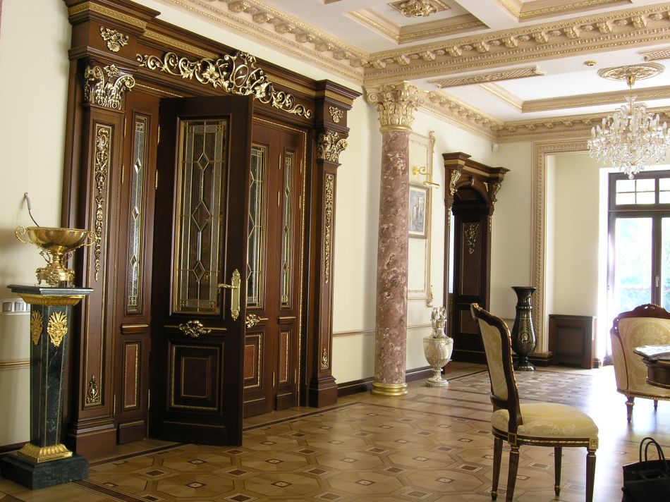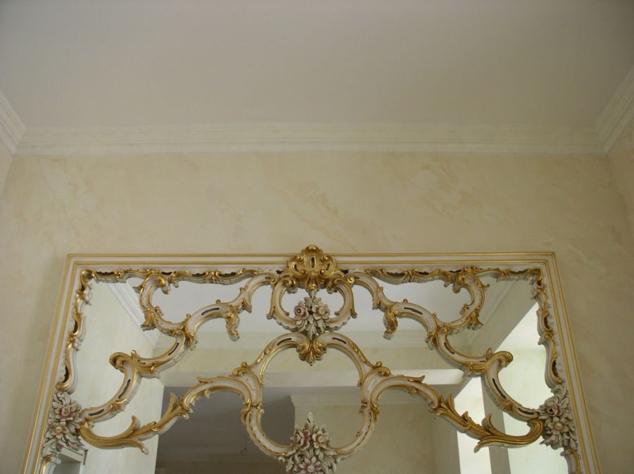 - Классические интерьеры активно применяют золотую поталь, которая добавляет сияния и благородства парадной обстановке. Золочение используют для потолочной лепнины (розеток, карнизов, фризов), настенных молдингов, капителей колонн и пилястр, отделки деревянной мебели. В украшении дверных арочных проемов этот прием помогает воссоздать античный портал.