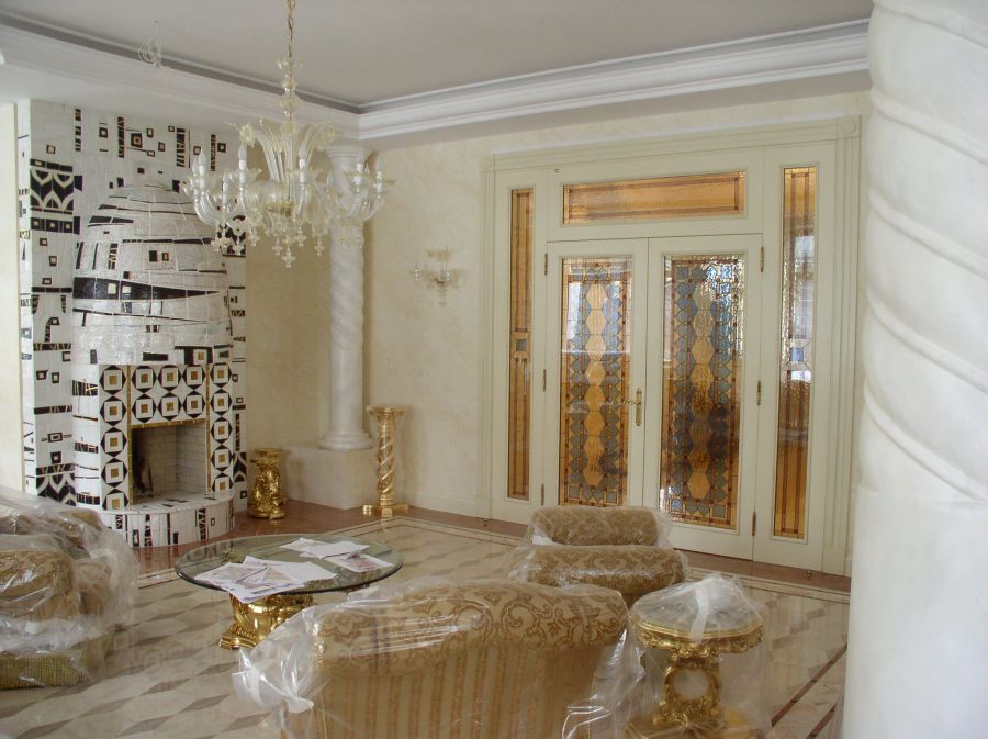 - В гостиной золотые элементы сосредоточены в дизайне зоны отдыха: массивное подстолье журнального столика, декоративные круглые консоли, подставка для каминных принадлежностей. Дверной портал с распашными полотнами оформлен позолоченными витражными вставками.