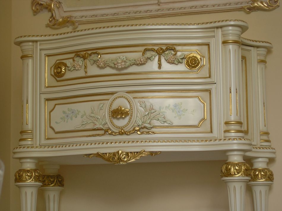 - В спальне поталью отделаны белый комод на тонких ножках (ручки, рельефный фриз под столешницей, декор внизу) и резное украшение на круглом зеркале.