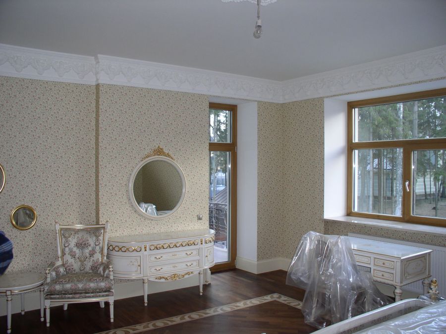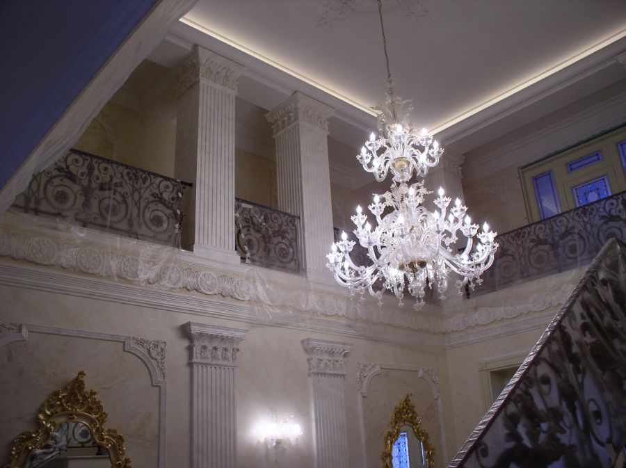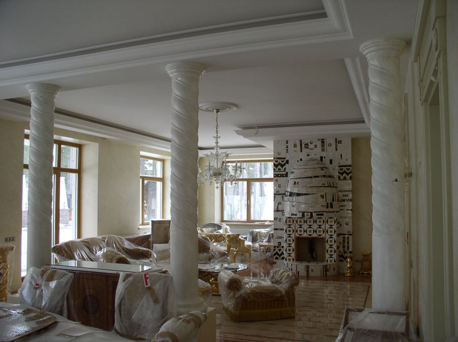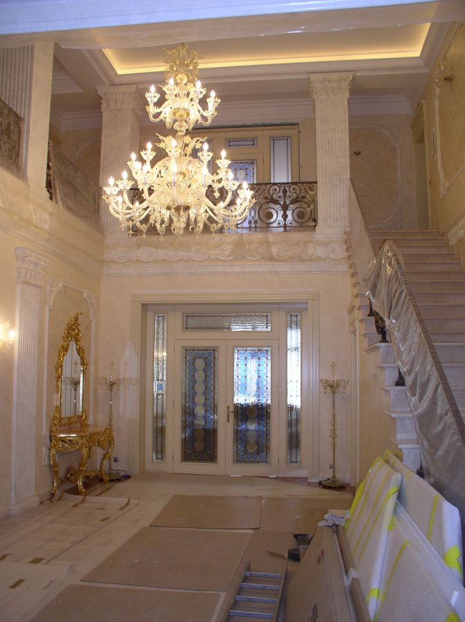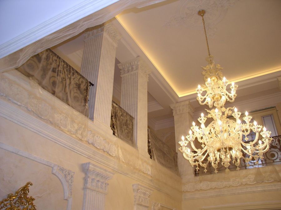 Проект обустройства загородного особняка выполнен в классическом стиле. В оформлении общественной части преобладают белые и кремовые оттенки, активно используется потолочная и стенная лепнина, мрамор и ковка в отделке лестниц. На создание дворцовой обстановки работает и интерьерное золочение.