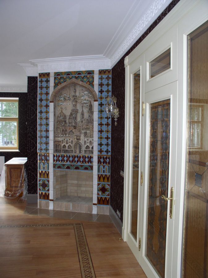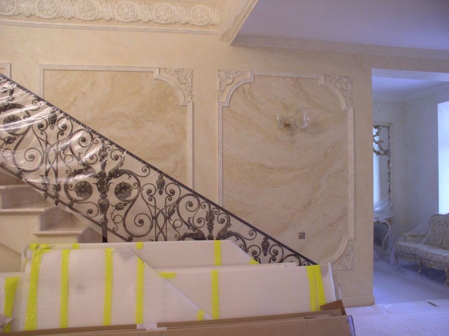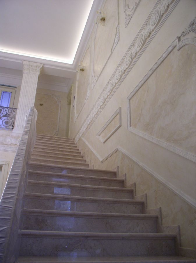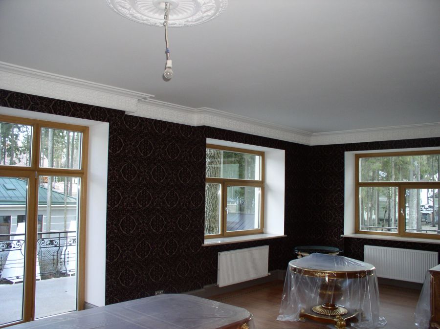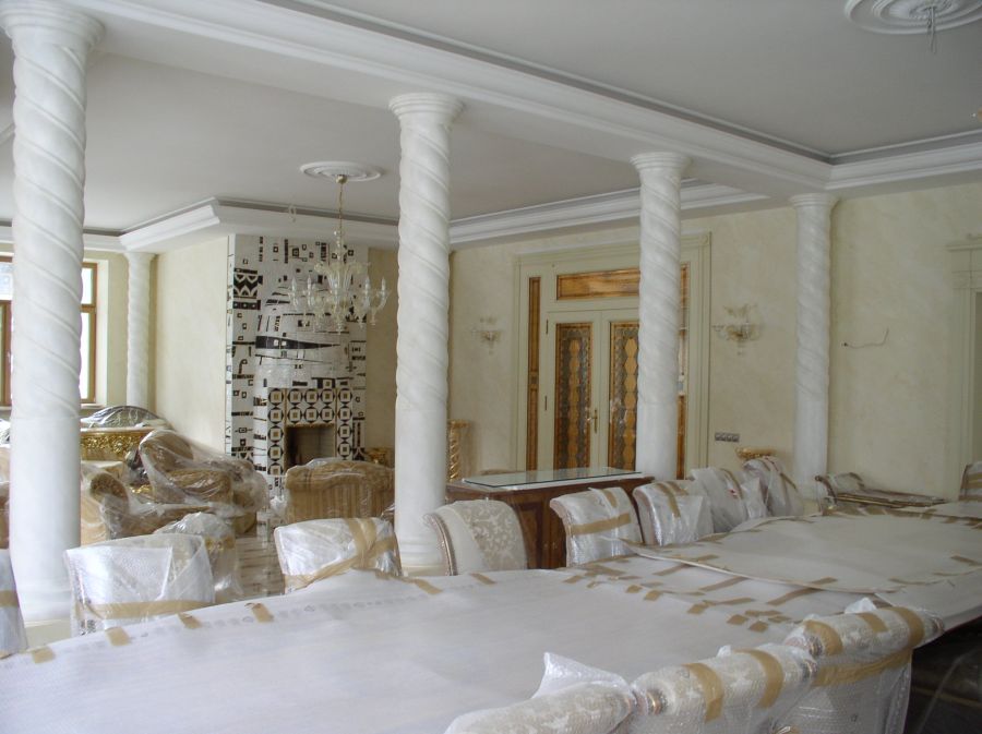 Проект обустройства загородного особняка выполнен в классическом стиле. В оформлении общественной части преобладают белые и кремовые оттенки, активно используется потолочная и стенная лепнина, мрамор и ковка в отделке лестниц. На создание дворцовой обстановки работает и интерьерное золочение.
