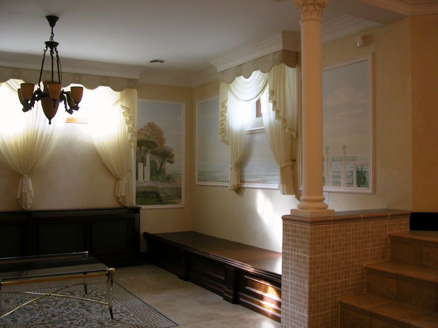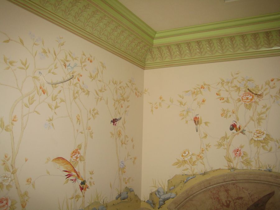 Если изображение большое, потребуется целая команда профессиональных художников-декораторов. Обращаться к специалистам потребуется в любом случае, т.к. интерьерная роспись – довольно сложная и дорогая в исполнении техника. При отделке элитной квартиры под ключ такая услуга входит в число производимых работ.