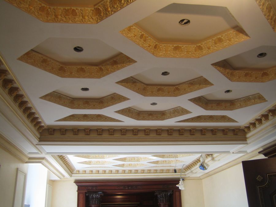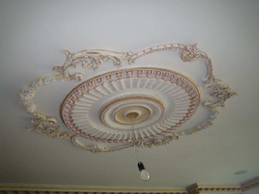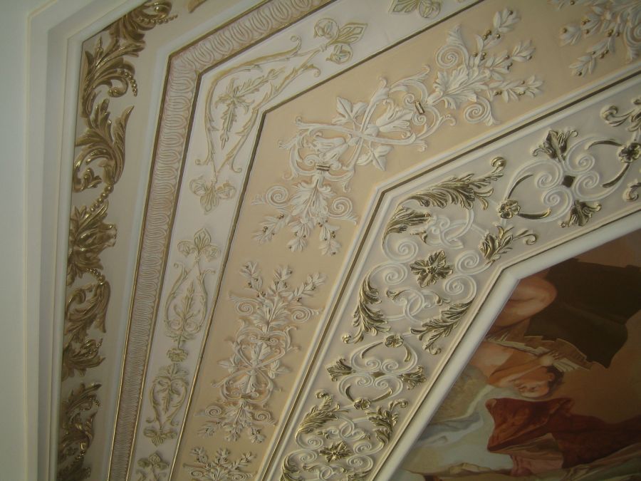 В центре потолка – розетка с объемными декоративными элементами. По периметру потолочную картину окружают несколько поясов лепнины, украшенной позолотой и окрашенной в белые и бежевые тона. Все вместе образует цельную, детализированную композицию в классическом стиле.