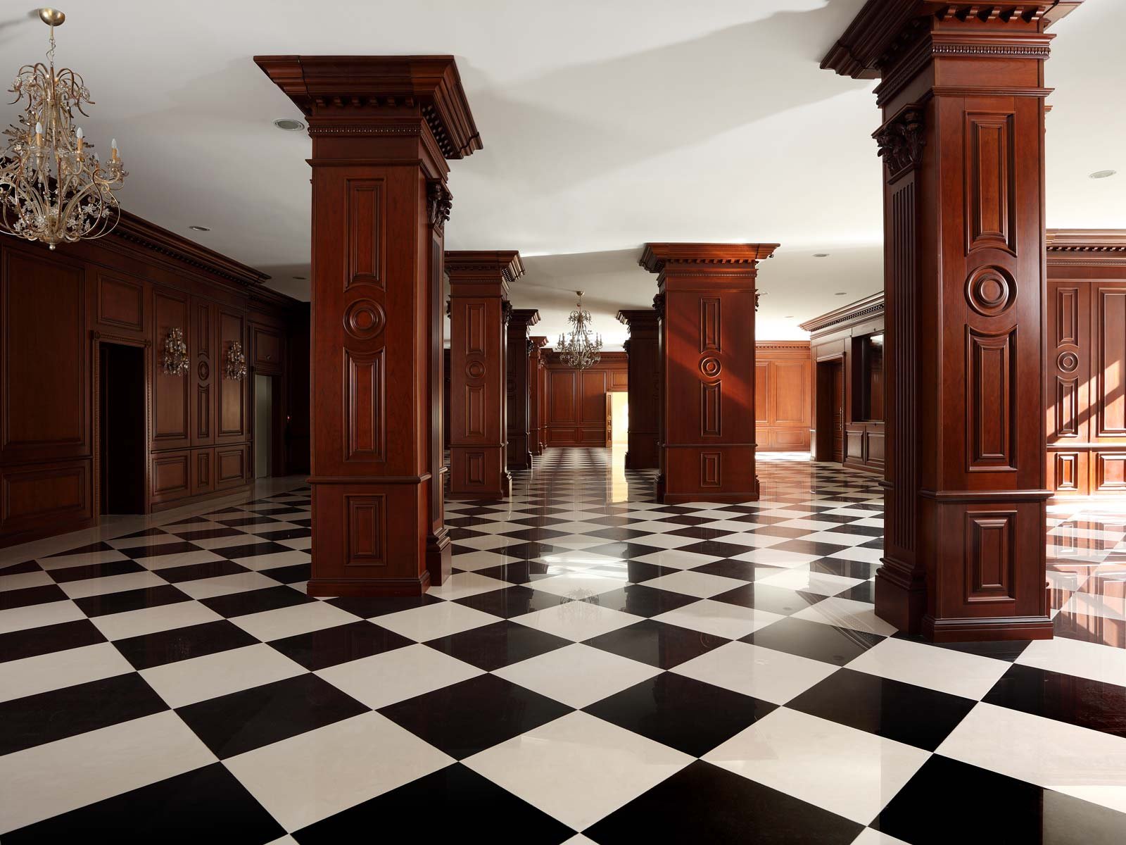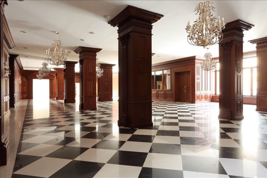 В дизайне обшитых деревом колонн повторяется оформление настенных панелей, благодаря чему огромное пространство холла кажется композиционно более собранным.