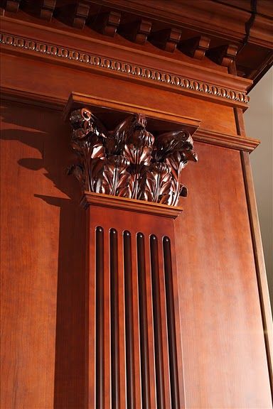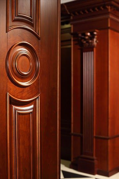 Парадное звучание интерьеру придает отделка деревом. Все стены, включая входную группу, обшиты деревянными панелями с классической филенчатой раскладкой. Насыщенная красно-коричневая древесина красиво переливается в солнечных лучах из высоких оконных проемов, обилие дерева отсылает к традиционным кабинетным интерьерам в викторианском стиле, дорогим и аристократичным.
