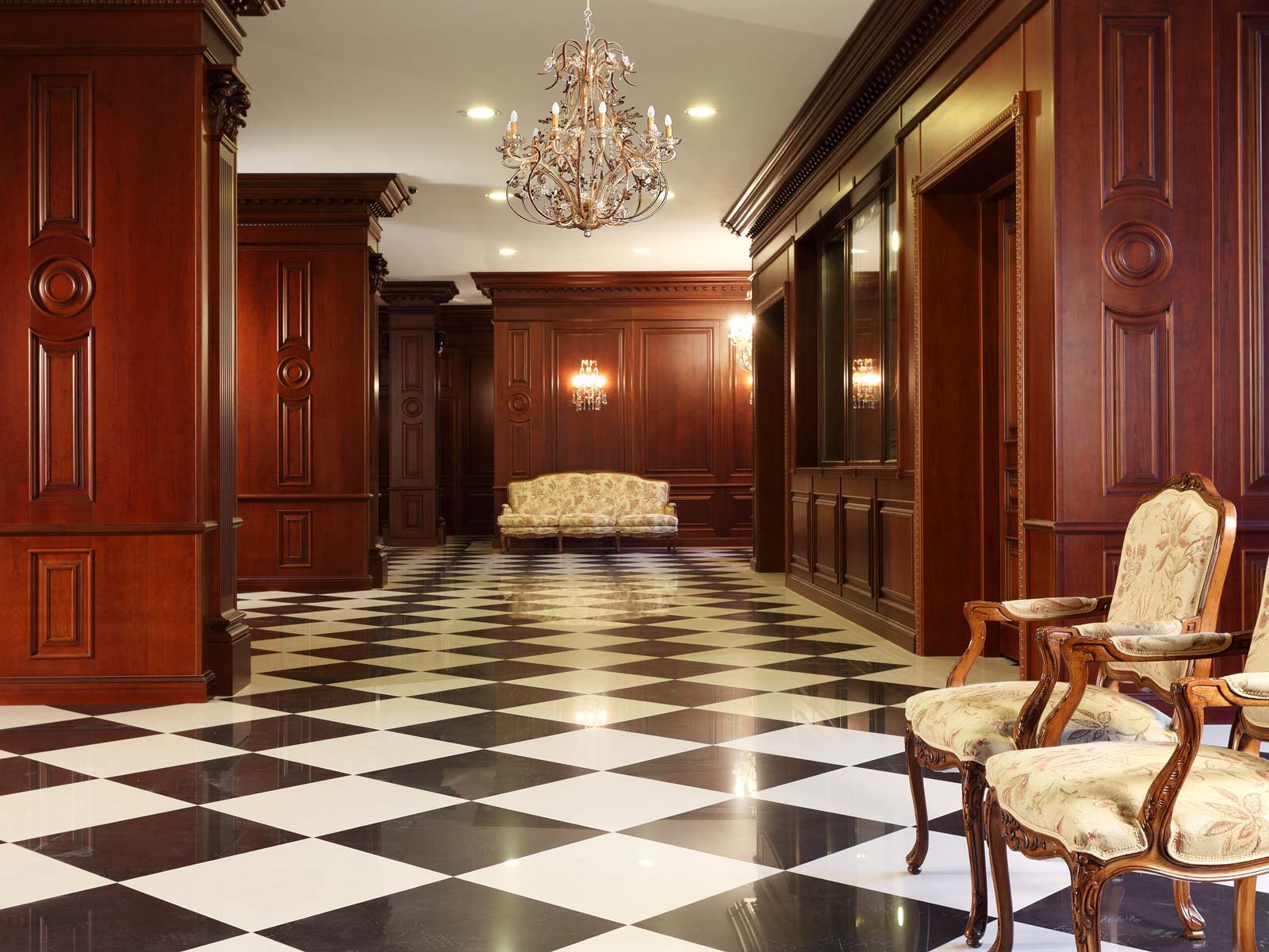 Классический стиль интерьера, выбранный для дизайна холла в столичном офисном центре и воплощенный в богатстве древесных фактур, с шахматным полом и массивной колоннадой, – это демонстрация стабильности, уважения к традициям, высокого статуса владельцев.