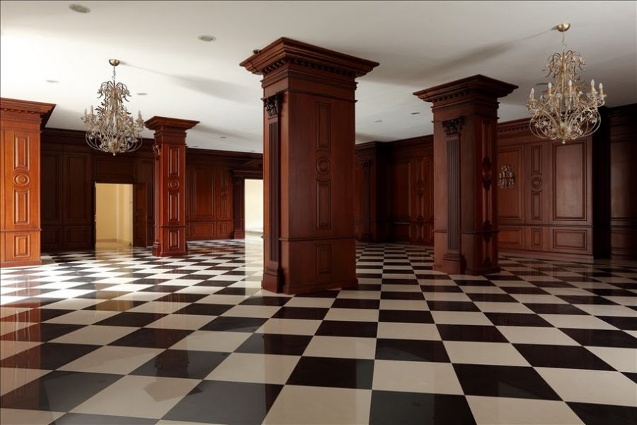 Подобную ассоциацию вызывает и диагональная шахматная раскладка из черно-белой плитки на полу. Крупные фрагменты подчеркивают масштаб помещения, завершаясь выложенным по периметру белым кантом.
