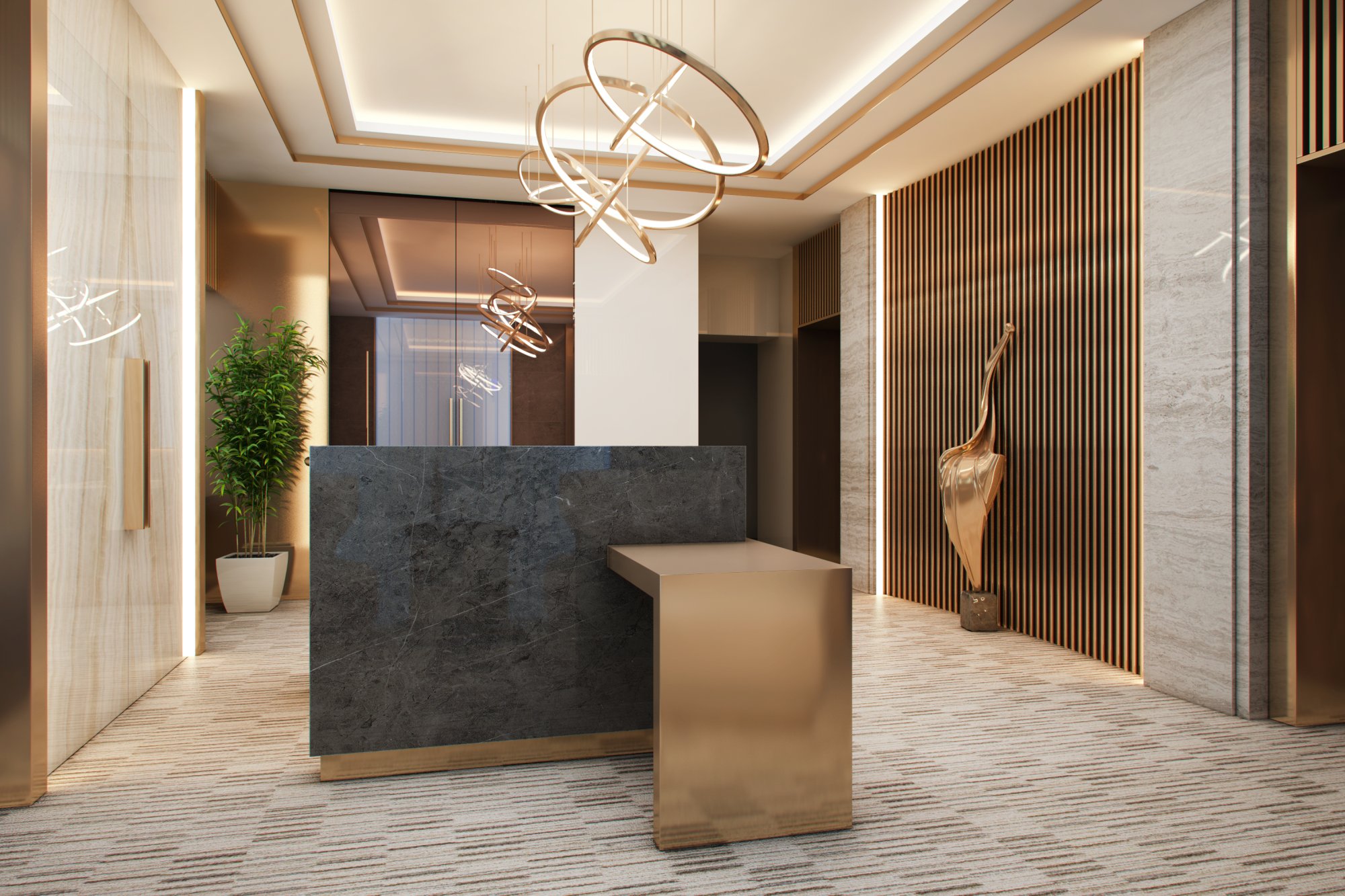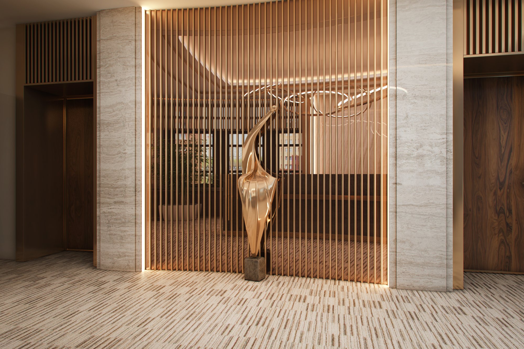Дизайн интерьера холла в офисе в теплых природных тонах