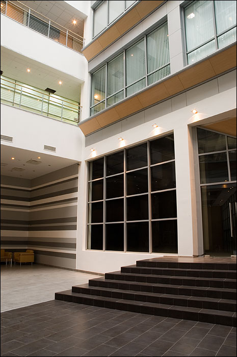 По задумке архитекторов вход в бизнес-центр решен в виде атриума: пройдя через небольшую арку с улицы, сотрудники и посетители попадают во внутренний дворик, с четырех сторон огороженный фасадами здания.
