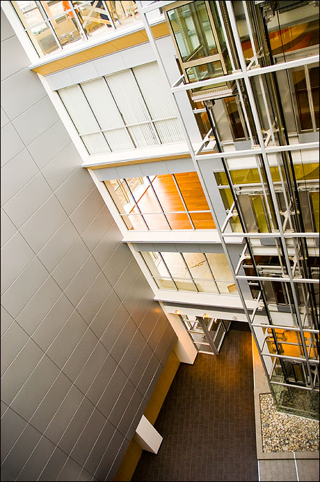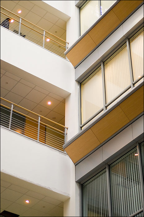 В атриум выходят не только помещения с панорамным остеклением (кабинеты, фойе на этажах), но и открытые переходы.