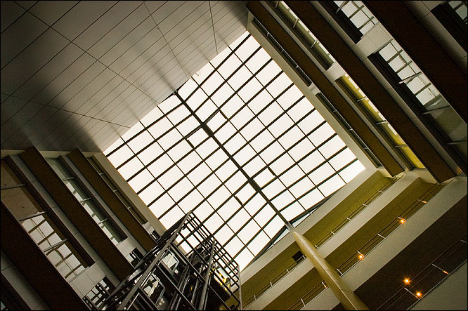 Вверху атриум ограничивается двускатной прозрачной кровлей, которая обеспечивает инсоляцию внутреннего пространства, а заодно и естественное освещение смотрящих во двор офисов.