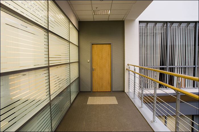 Принцип контраста применен и в дизайне входных дверей. Выбраны двери из матового тонированного стекла, практически черного, из такого же материала выполнено остекление холла. Чистый белый цвет фасадной облицовки и оконной раскладки в сочетании с черным создает динамику. Введенный в экстерьер бизнес-центра белый цвет поддерживают выкрашенные основания балконов.