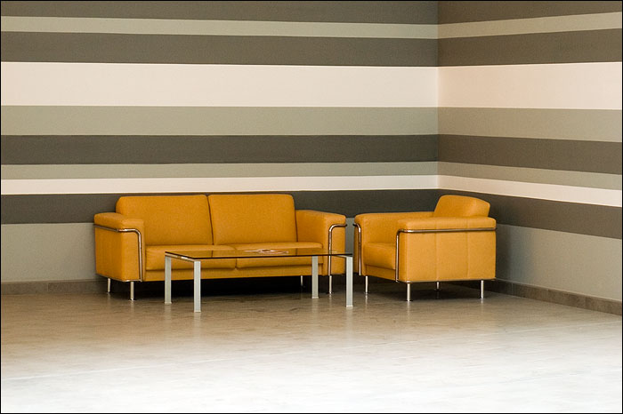 Слева от входа в атриуме обустроена зона отдыха, под навесом второго яруса. Диван и кресло яркого песочно-желтого оттенка и характерного для хай-тек дизайна – сочные акценты в окружении градаций серого, в тон которых окрашены стены.