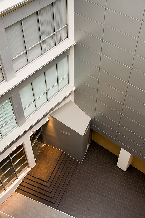 Одна из стен представляет собой глухой фасад, облицованный панелями стального цвета. Она задает нейтральный и в то же время активный фон для всего атриума. Цветовым акцентом выступает теплый песочный оттенок, вводимый фасадными панелями в зоне входной группы и на треугольных горизонтальных выступах между этажами.