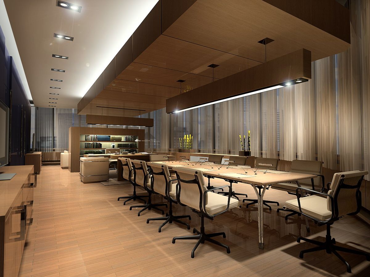 В этом предложении рабочая и переговорная зоны располагаются вдоль одной оси и воспринимаются цельной композицией в центре помещения. Место у окна занимает длинная тумба с живыми растениями, эта зона выделена точечной подсветкой.